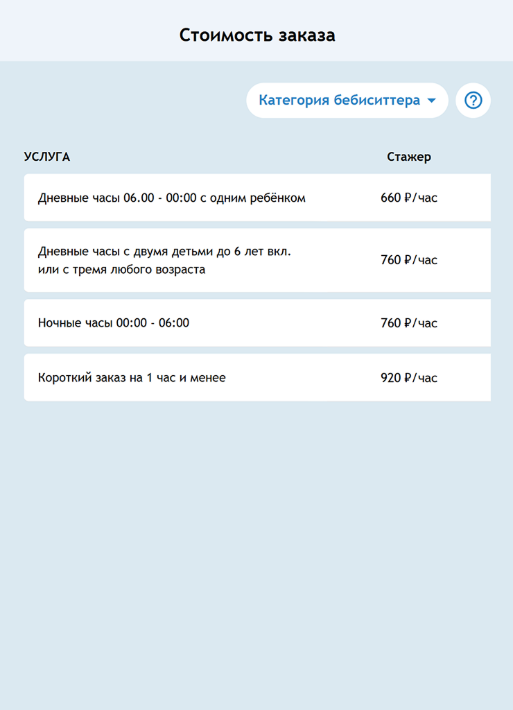 Раньше заявка на подбор в «Мамином времени» стоила от 340 ₽ и действовала четыре недели: за это время находили подходящего специалиста. Стоимость заявки не зависела от того, на какой период подбирали бэбиситтера — на год или несколько часов.