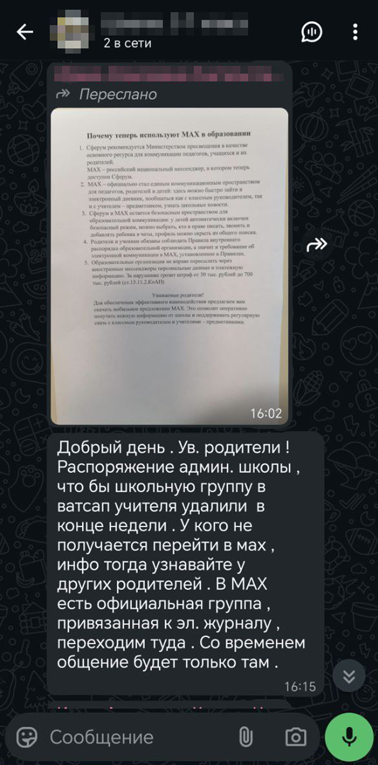 Наш родительский чат изначально был в «WhatsApp»*. Но перед осенними каникулами школа внезапно одним днем ограничила там публикацию сообщений и сказала всем переехать в Max. После каникул чат в WhatsApp* открыли обратно, потому что родители просто не перешли в Max.