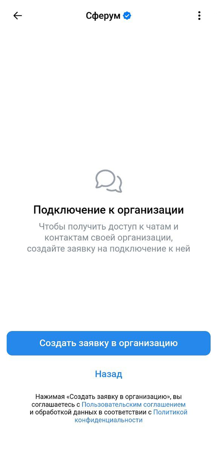 - Нажмите «Отправить заявку» и ждите. После того как заявку рассмотрит администратор, вы присоединитесь к организации и основным чатам.