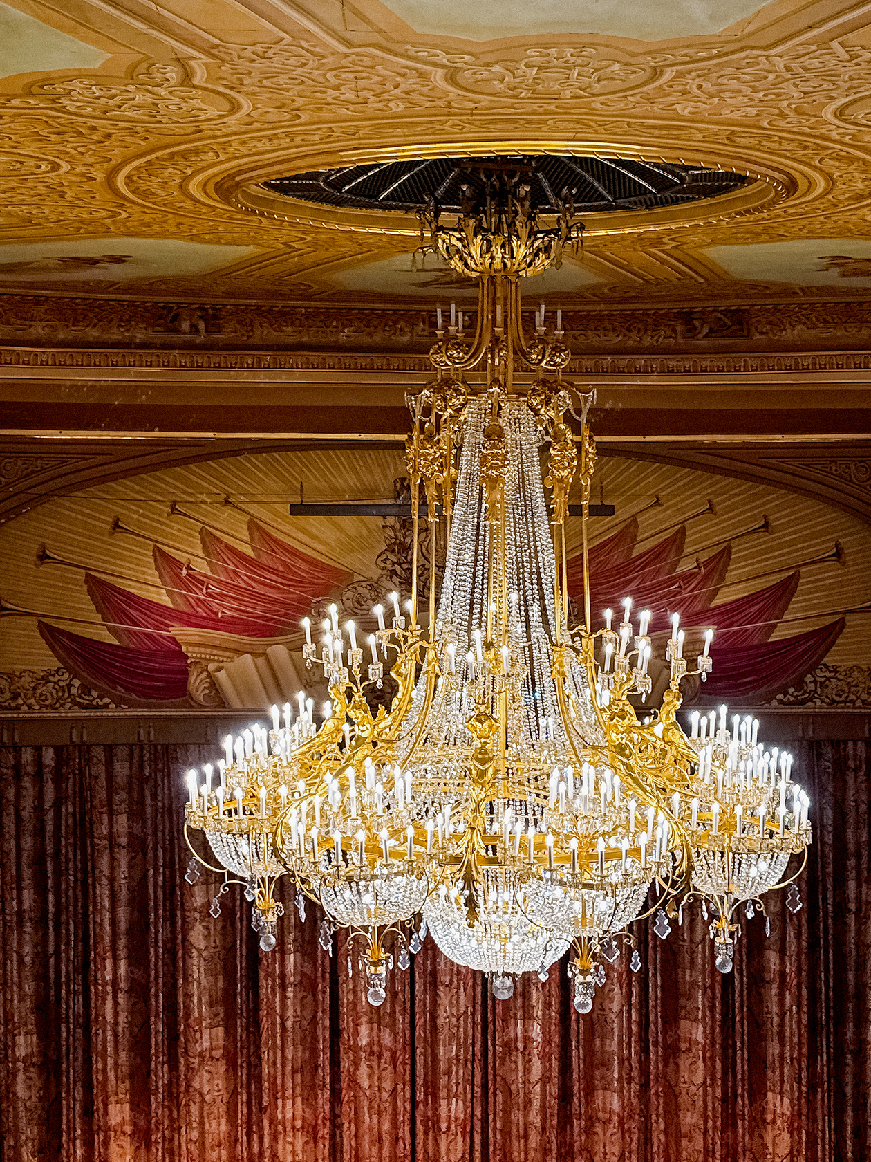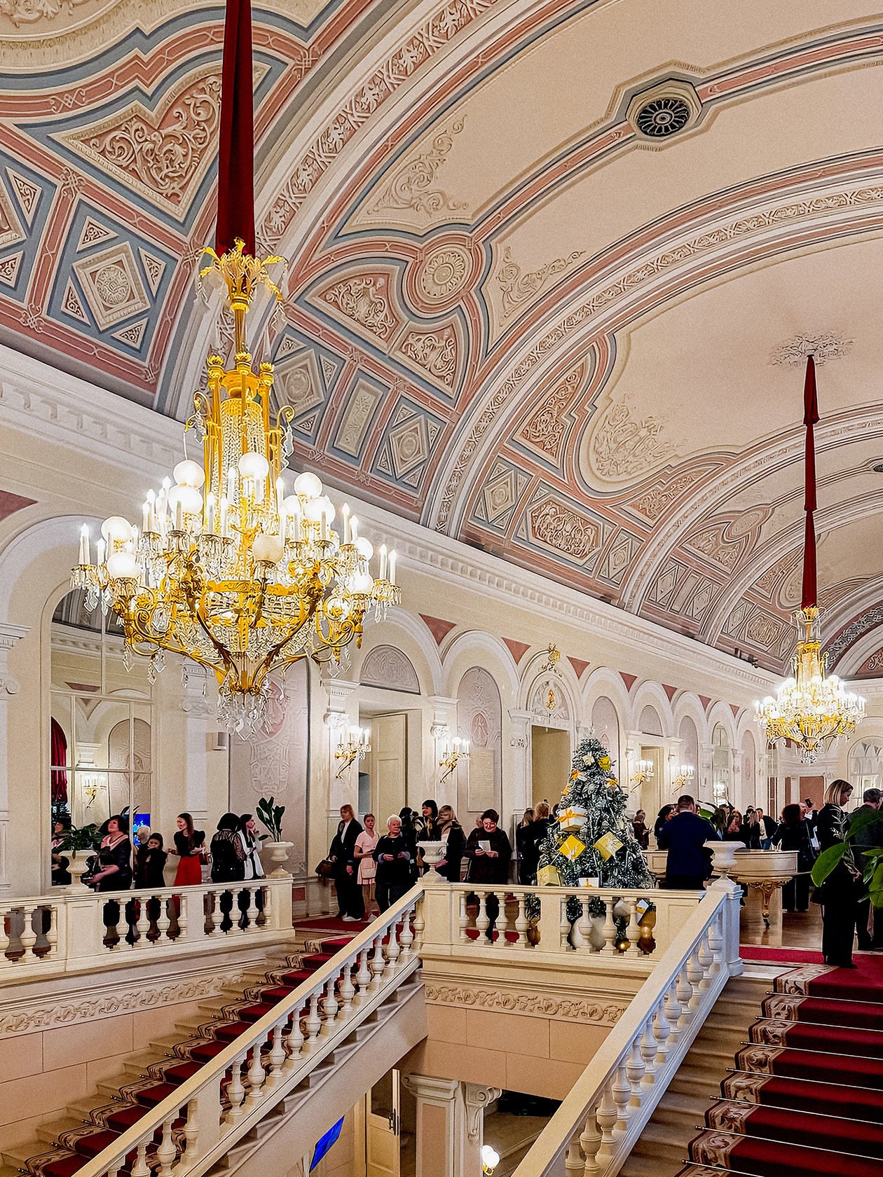 В антракте все бежали фотографироваться в выставочный зал или вставали в очередь на снимок с люстрой. Думаю, я попала в кадр как минимум к двадцати незнакомцам, но прекрасно понимаю, что людям хотелось запечатлеть себя в праздничный день в красивом месте. В буфет я заглянула еще перед спектаклем — на бутерброд с колбасой и кофе. За все отдала 700 ₽, цены не шокирующие, в Михайловском театре в Петербурге, например, дороже.