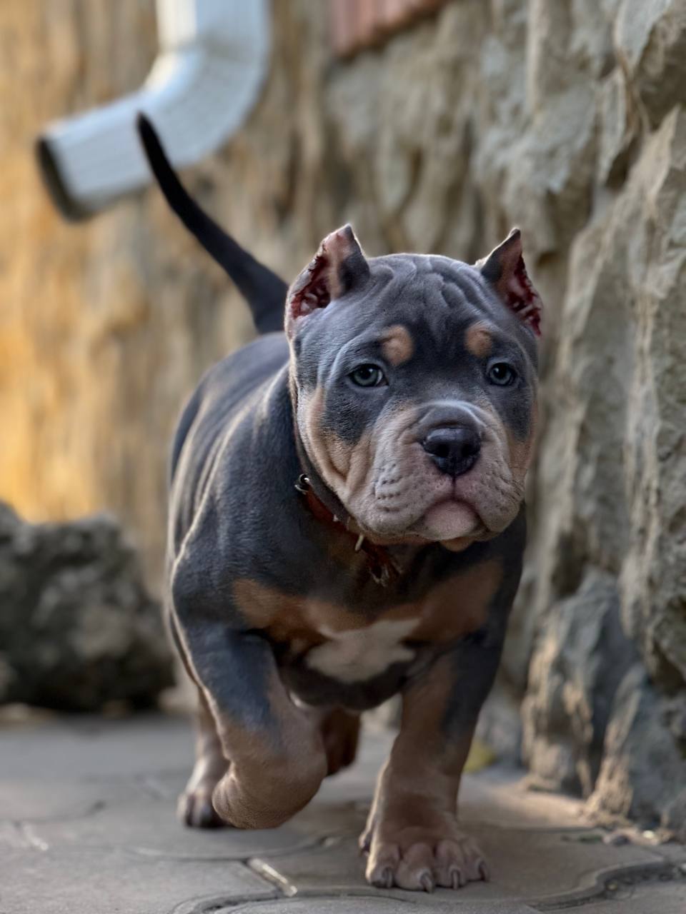 Это щенок американского булли, хоть он еще совсем маленький, но уже серьезный и идет по своим делам.