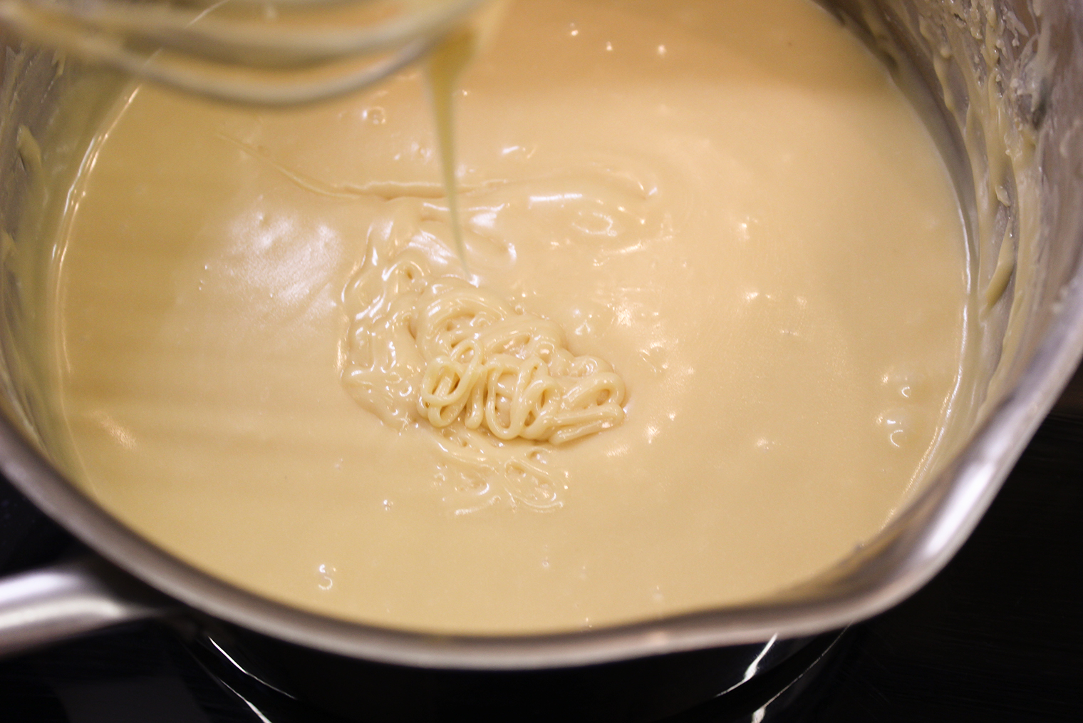 Шаг 1. Масло, сгущенку и 110 г сахара соедините в кастрюле. Варите на слабом огне, периодически помешивая, до загустения и легкого карамельного цвета.