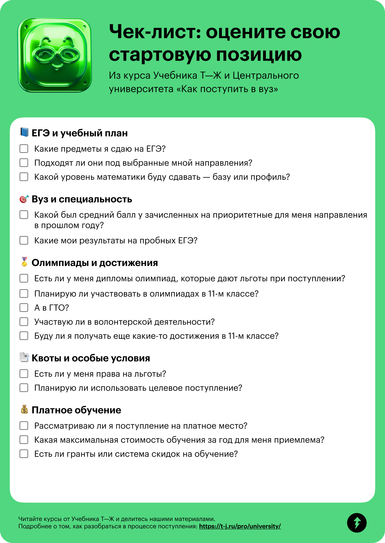 Про каждый шаг подробно рассказываем в бесплатном курсе Учебника Т—Ж «Как поступить в вуз». Следуя теории и практике уроков, вы сможете оценить свои шансы и понять, куда лучше поступить.