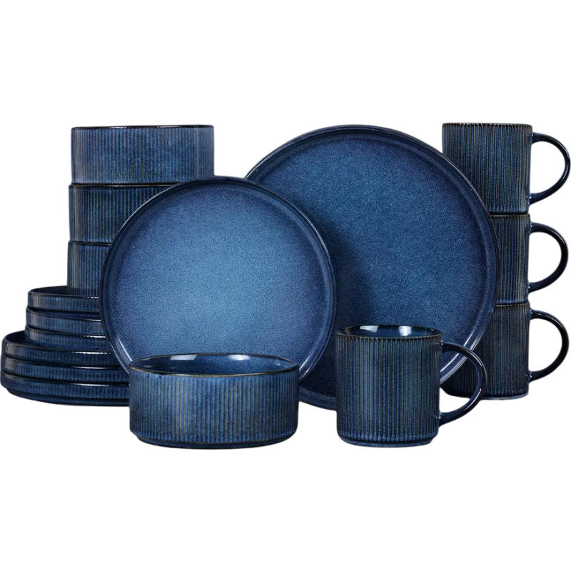 Наборы столовой посуды на четыре — шесть персон. В комплекте кружки, плоские тарелки двух размеров и глубокая посуда — для супа или салата