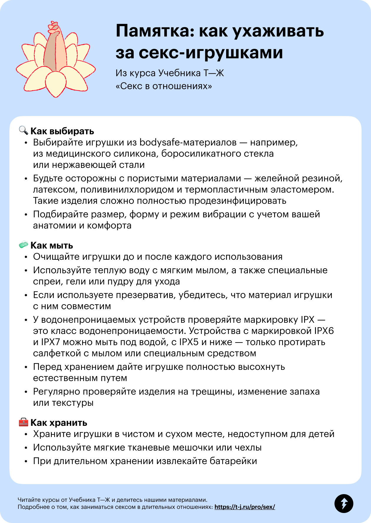 Существует ряд несложных правил, которые помогут правильно хранить и очищать игрушки, — собрали их в этом чек-листе из бесплатного курса Учебника Т—Ж «Секс в отношениях». В уроках подробно раскрываем каждый пункт, а еще рассказываем, как работает либидо, как аккуратно разговаривать на интимные темы и поддерживать близость.