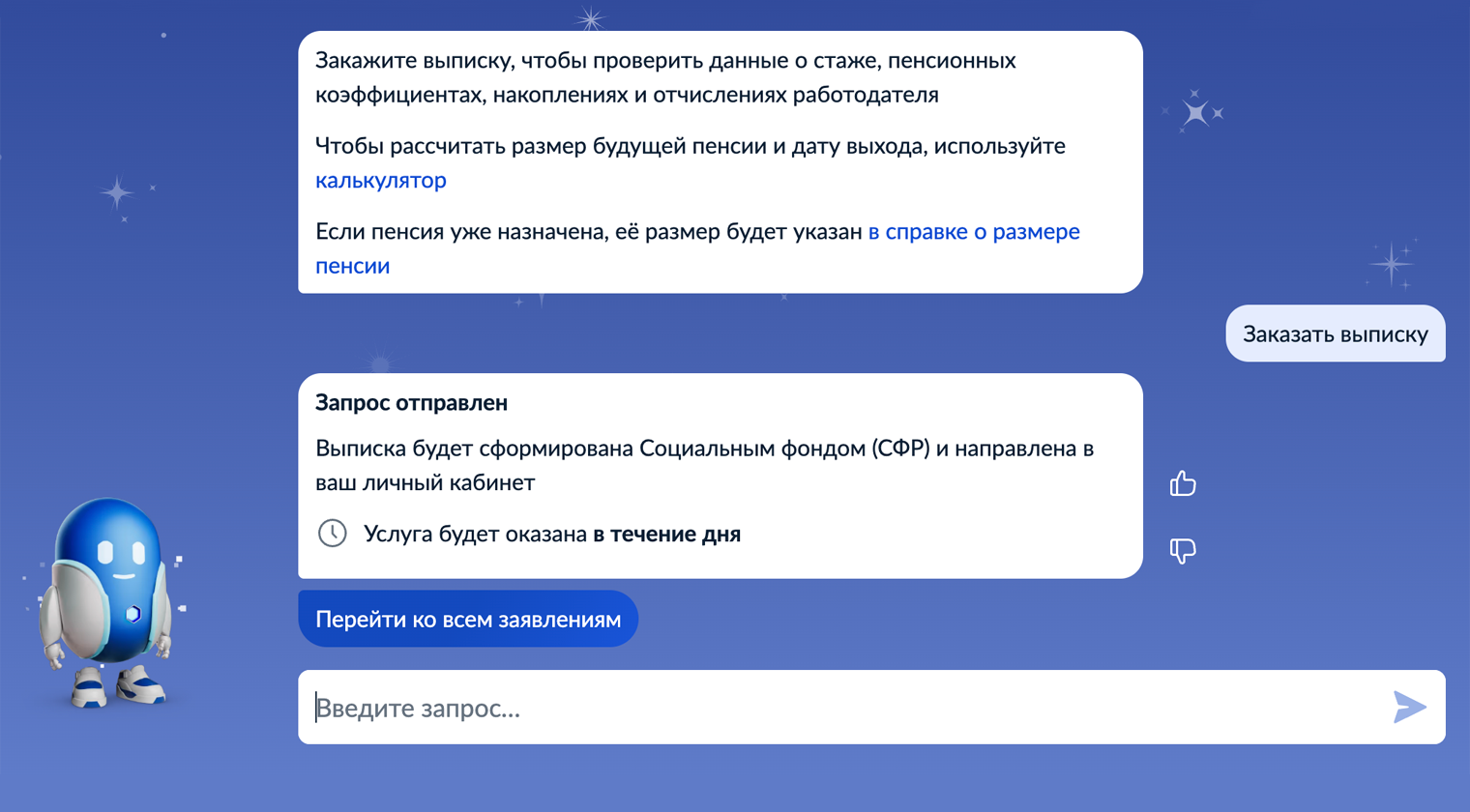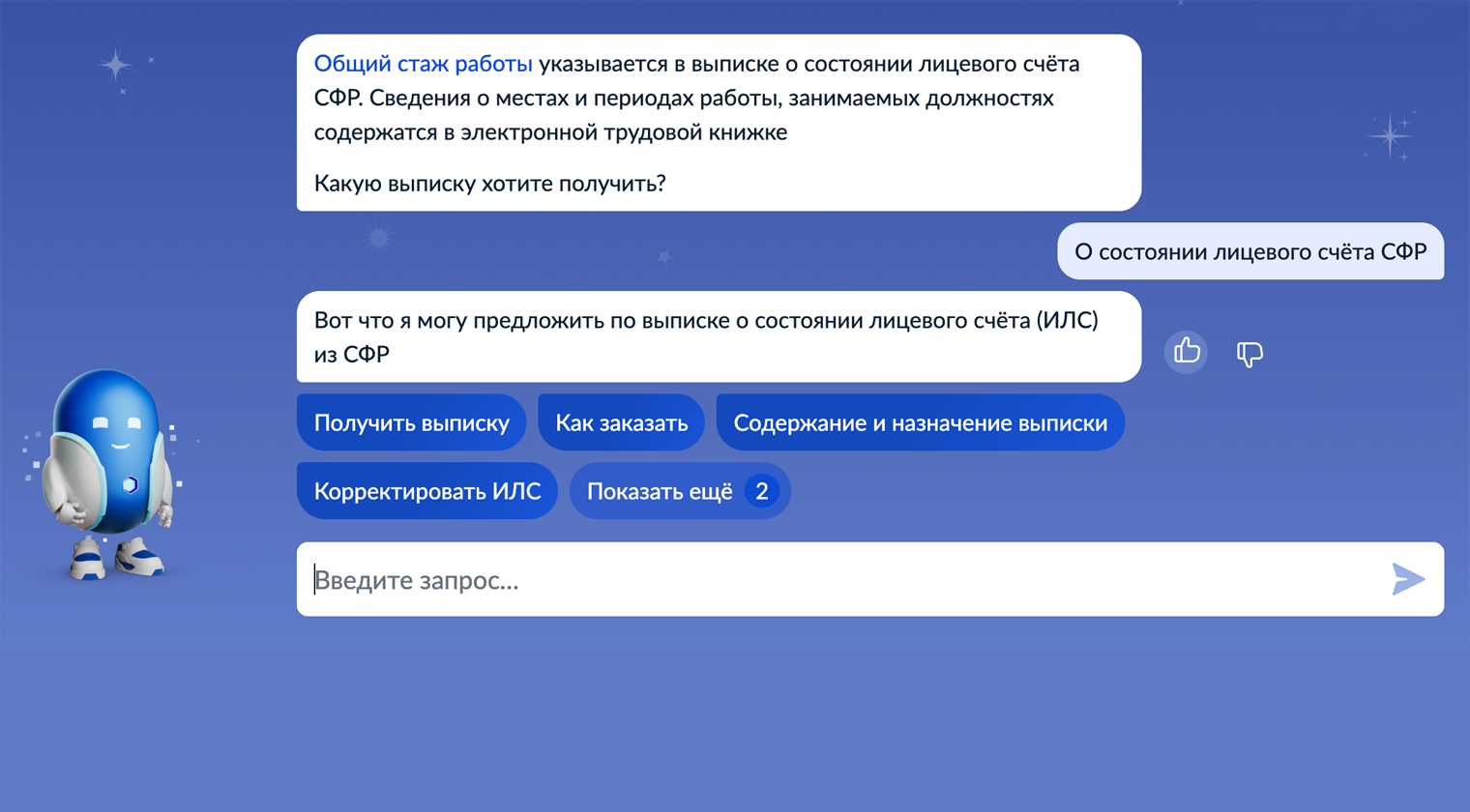 - Робот предложит сделать выписку о состоянии лицевого счета СФР. Выберите этот вариант.