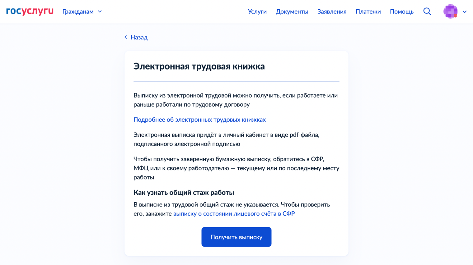 Электронная трудовая книжка показывает историю трудовой деятельности: где, когда и на каких должностях работал человек. А узнать общий страховой стаж удобнее с помощью выписки о состоянии лицевого счета СФР. Запросить документ можно на госуслугах — через робота Макса или каталог.