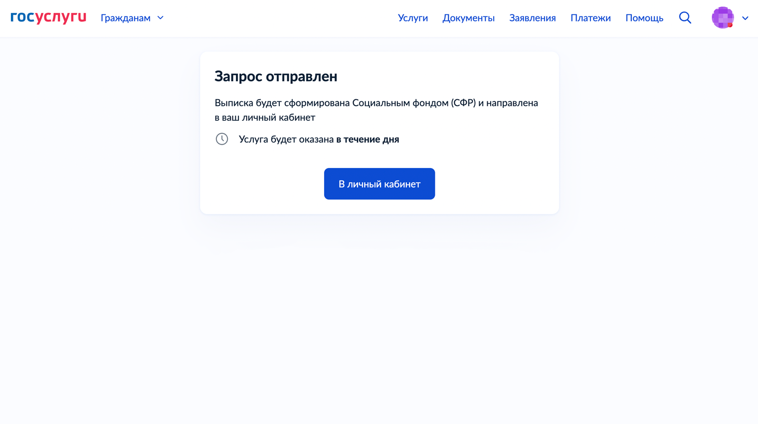 Когда выписка будет готова, вам придет уведомление в личный кабинет и на электронную почту. Робот обещал сделать ее в течение дня, но в моем случае прошло три минуты.