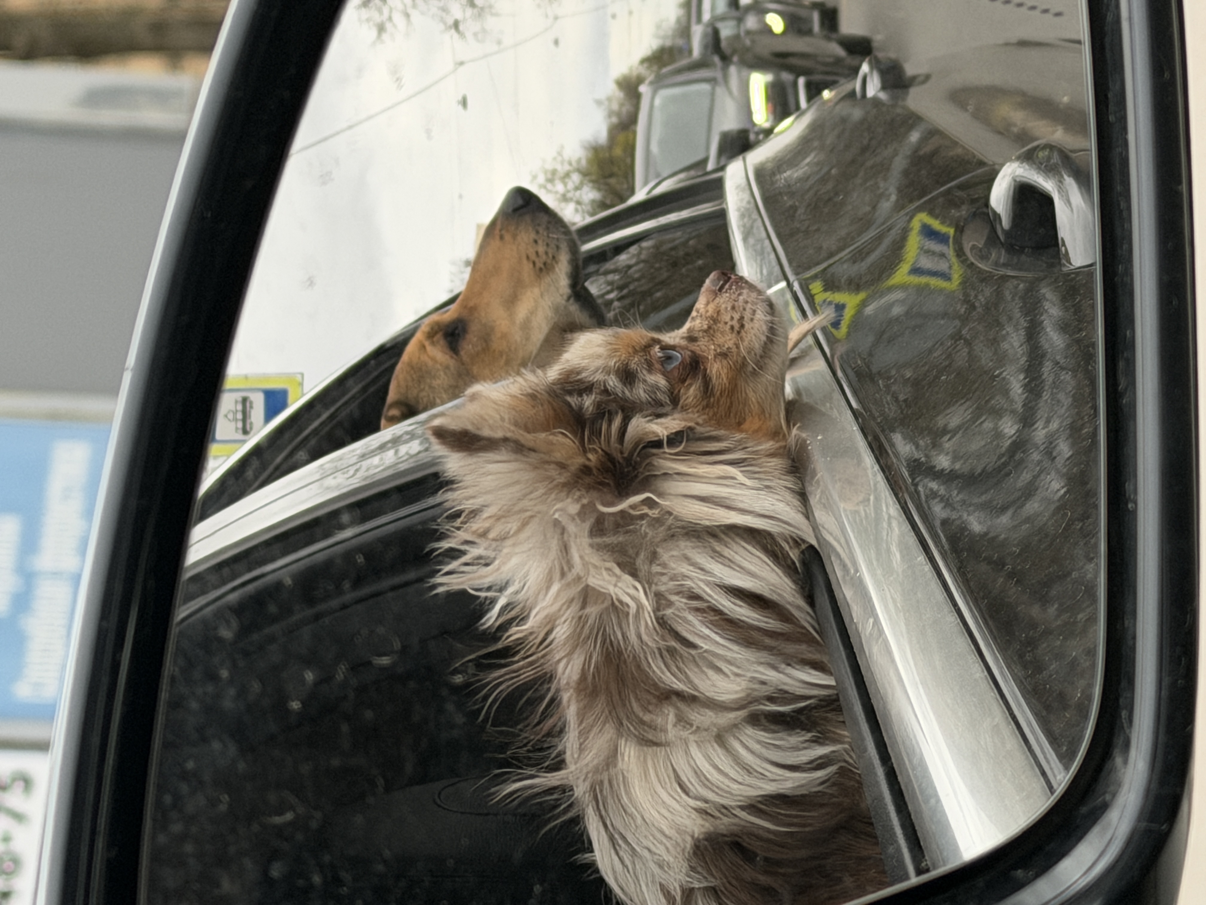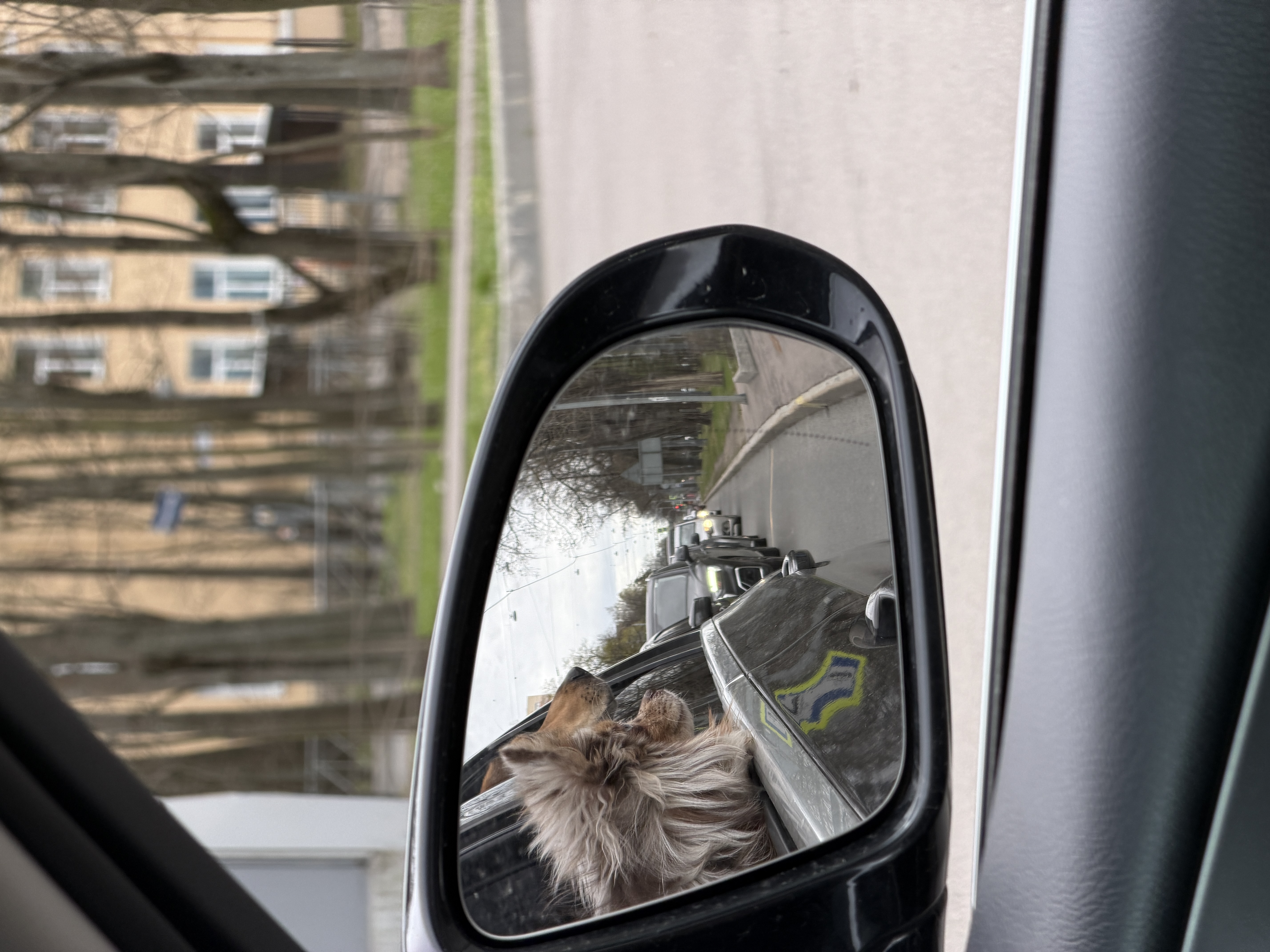 Мы часто ездим по делам или за город с бандой своих собак. Трое из четырёх обожают смотреть в окно. В кадре двое рыжих: шпиц Куки и метис Есеня. Обе комментируют всё происходящее вокруг и умиляют прохожих и водителей