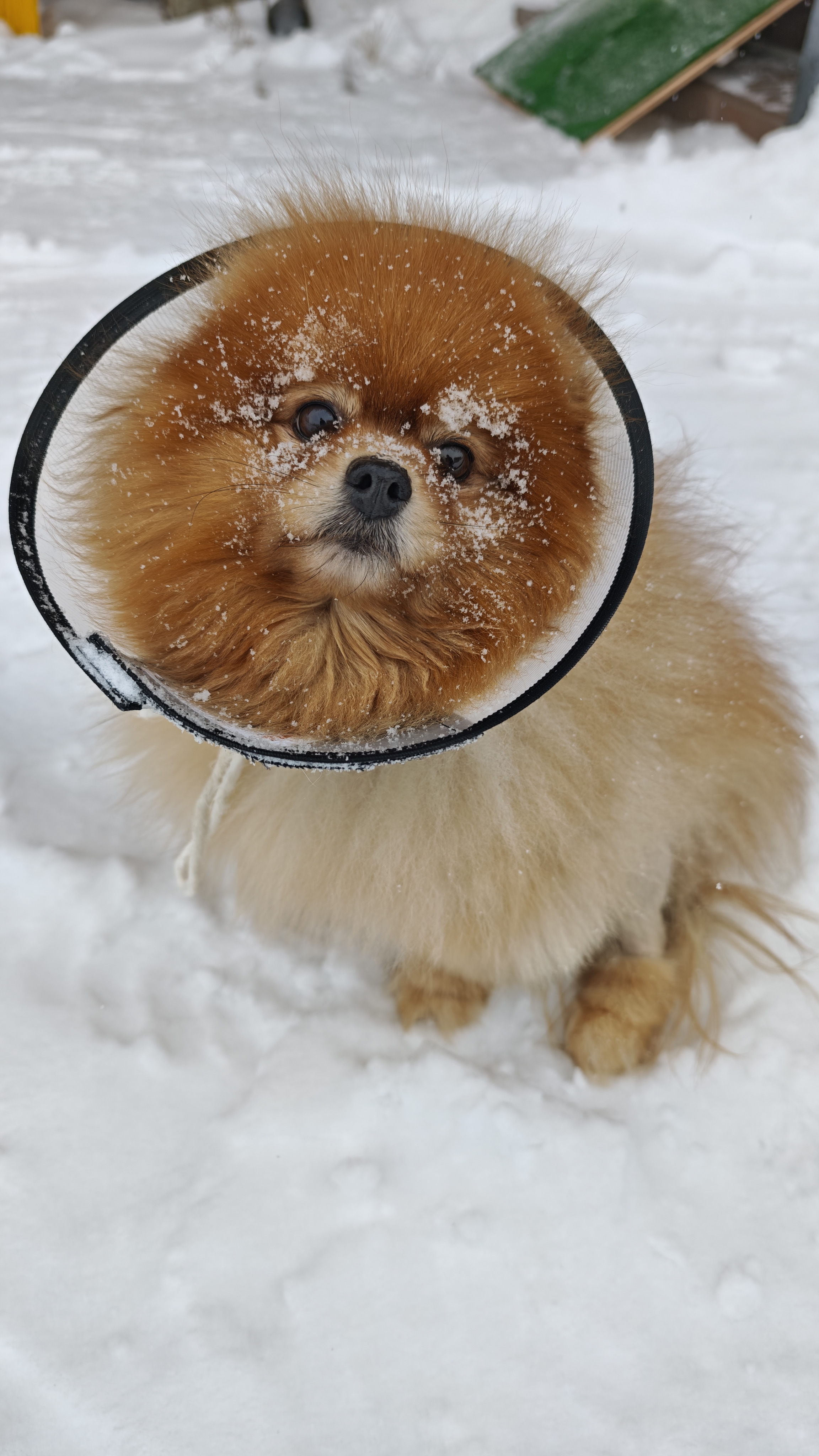 Шпиц Марсель, 8 лет, после операции (порвал связки на задней лапе). Нашел себе новую забаву — прыгает на оставшихся трёх лапах и сгребает снег своим приспособлением. Наверное думает, что он трактор.