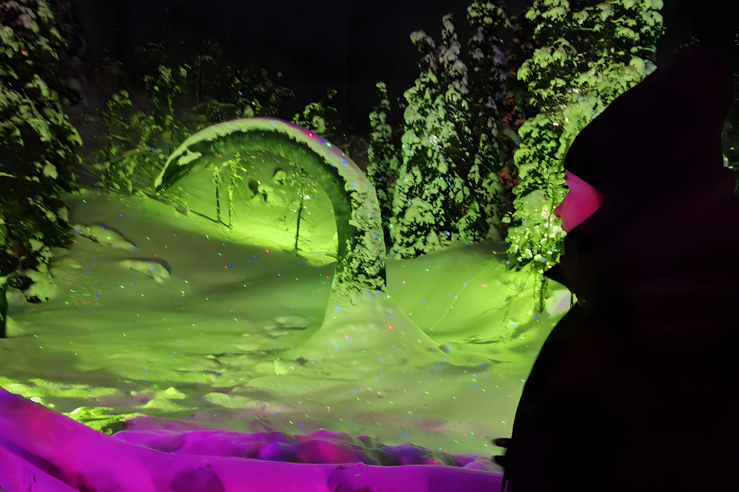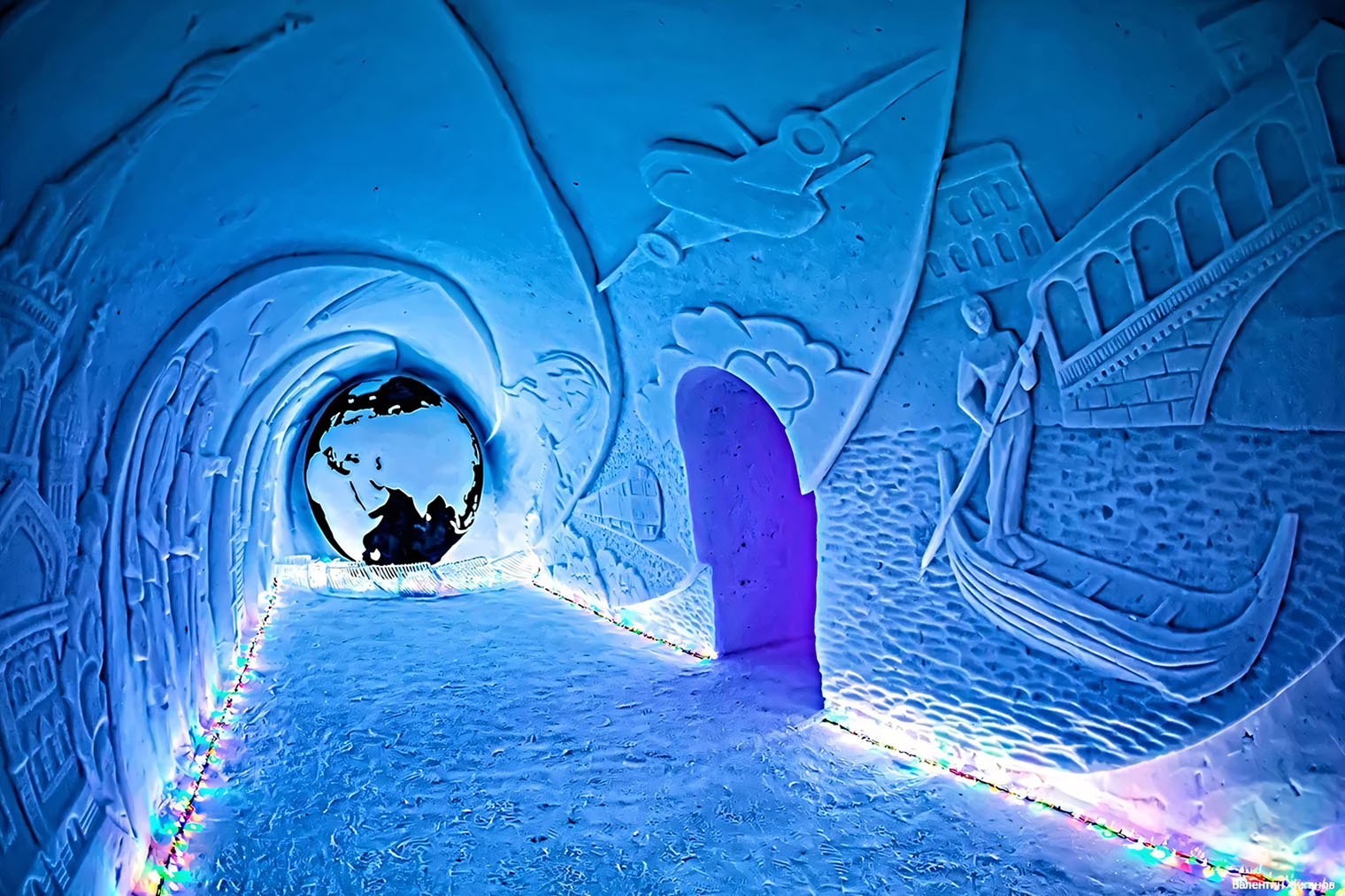 Снежная деревня — это большая искусственная пещера с переходами и тоннелями. Мастера ледовых скульптур вырезают на ее стенах снежные картины и строят в нишах арт-объекты. Каждый год тематику Снежной деревни меняют: так, в один сезон это герои советских мультиков, в другой — чудеса света, в третий — машина времени и исторические события. Вход платный.