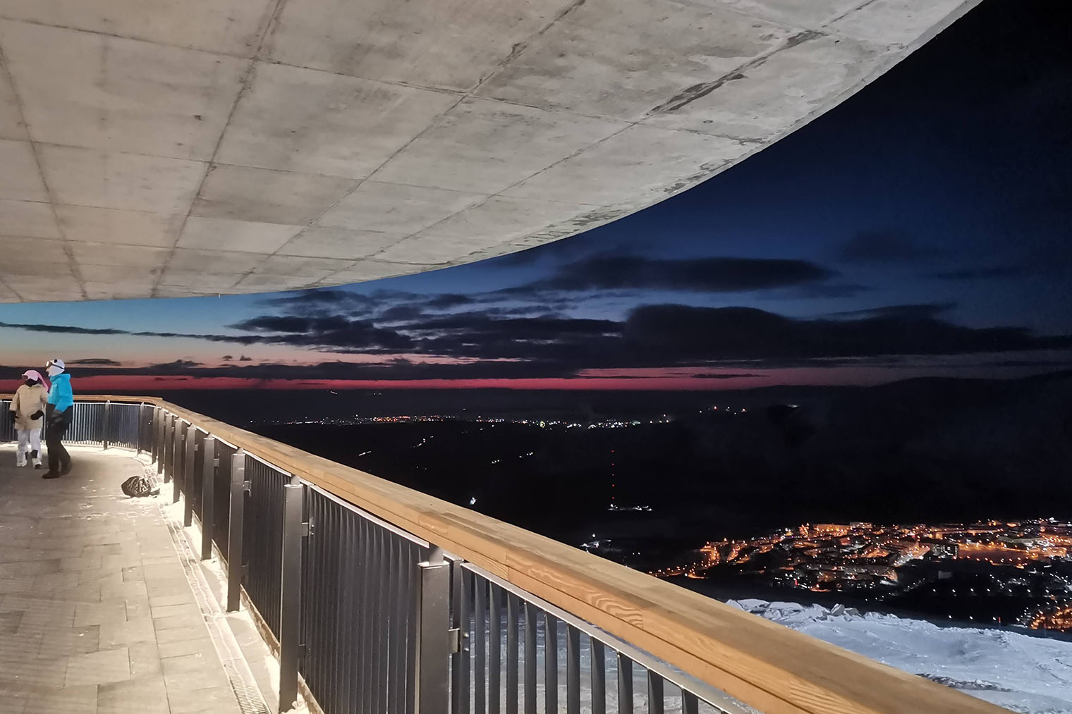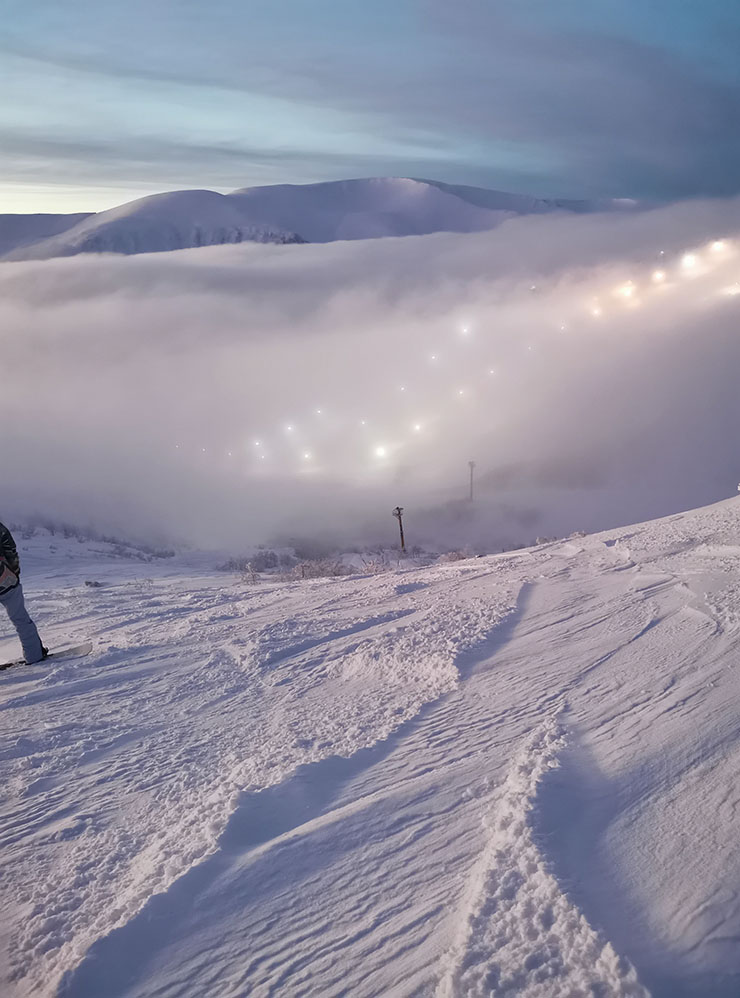 То есть с ноября примерно по 10 января почти все время темно, при этом на гору может внезапно наползти туман. Советую ездить только по освещенным трассам и надевать очки с прозрачными или желтыми линзами — для лучшей видимости.