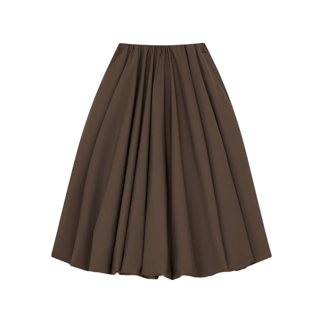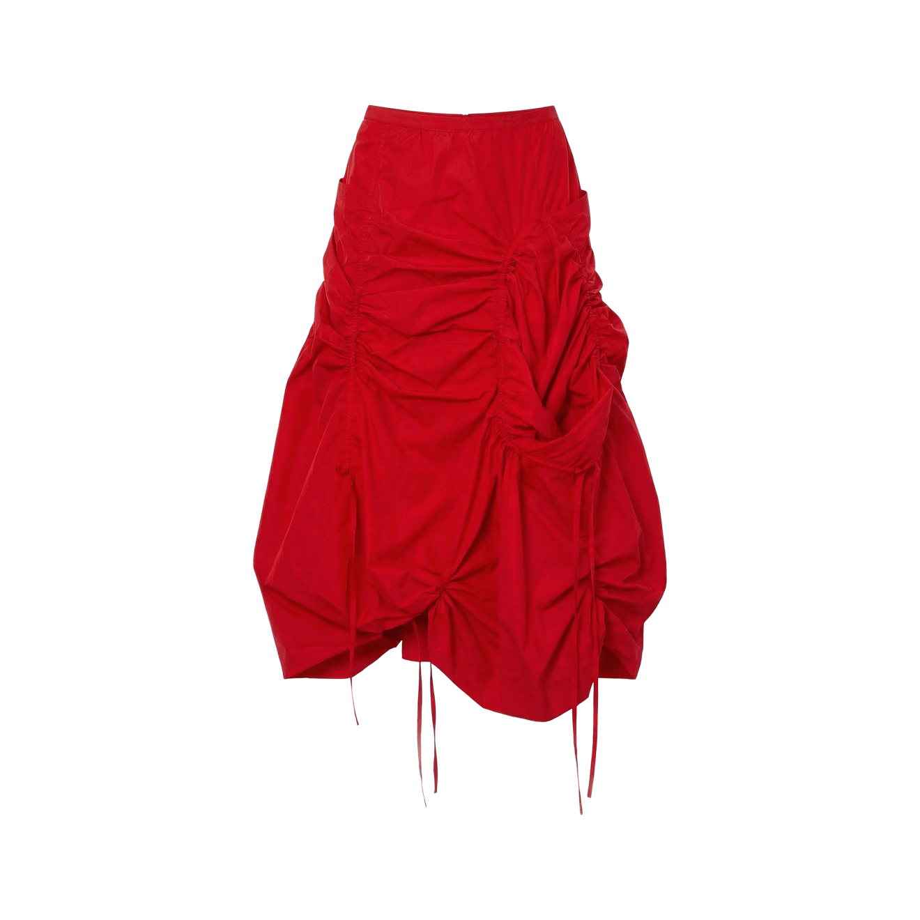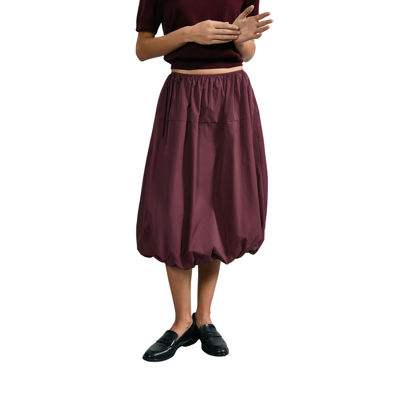 Такая частая цикличность во многом объясняет громкое возвращение тренда в 2026 году. На подиумах встречались самые разные вариации юбки-баллона: ультракороткие, модели длины миди и макси, с высокой или заниженной талией, простого или асимметричного кроя. Доминировали версии из плотного хлопка, тафты, сатина, поплина и аутдор-юбки из легких плащевых тканей с характерными кулисками, как в коллекции Ahluwalia.