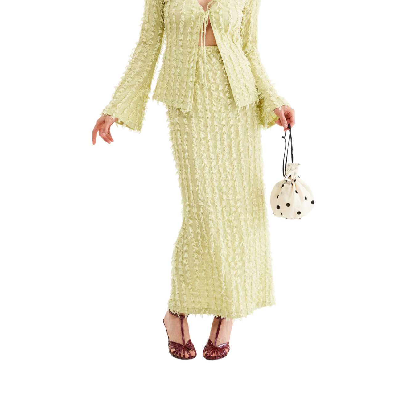 Юбка выполнена из легкой эластичной ткани с объемным ворсистым рельефом. Благодаря простому крою и нейтральному нежно-салатовому цвету ее легко вписать в повседневные образы. В городе юбку можно сочетать со строгими рубашками или воздушными блузами и классическими лодочками, с базовыми футболками и кедами, а на отдыхе — с ажурными топами или бикини и плетеными сандалиями
