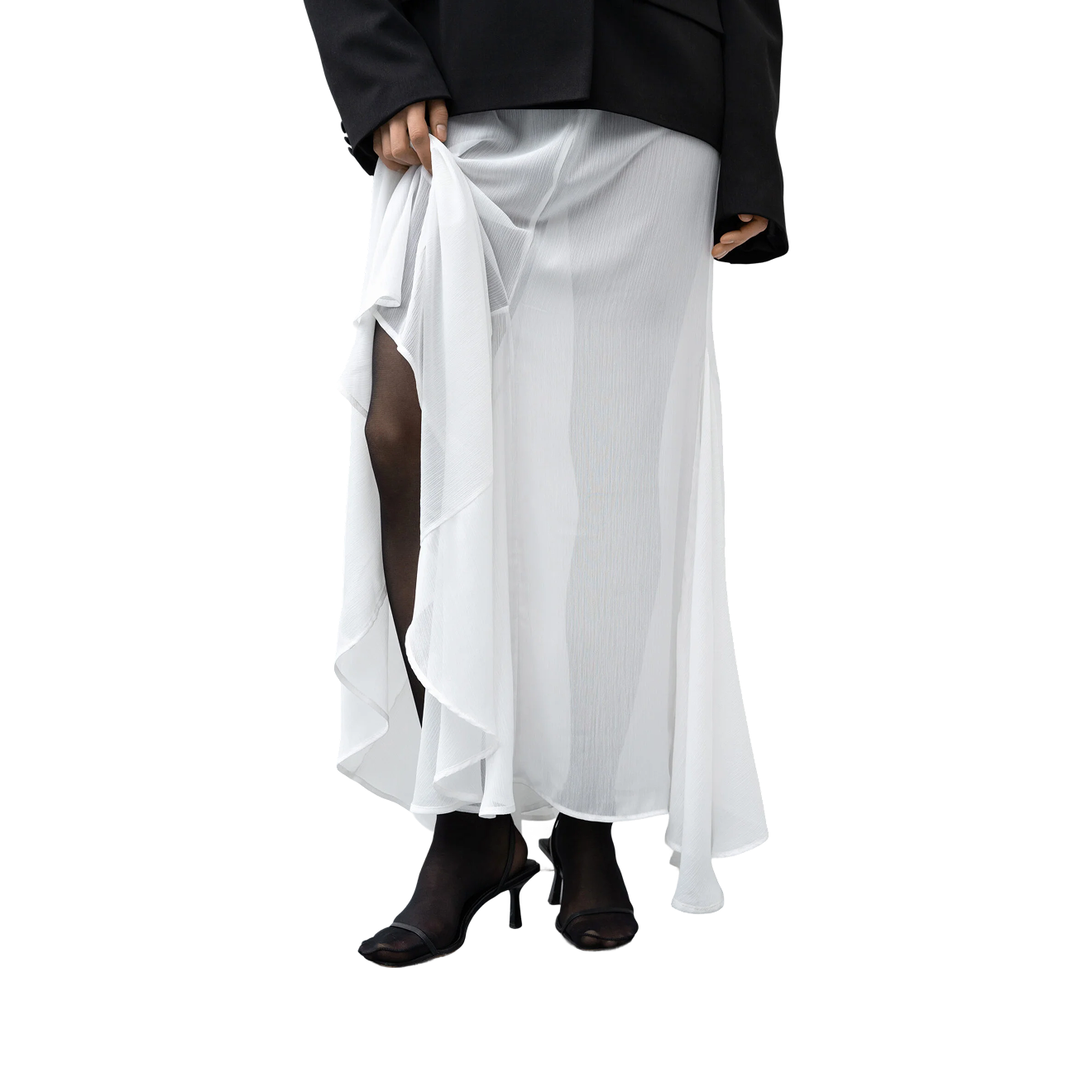 Летящая полупрозрачная юбка макси — отличный способ добавить образам воздушности и динамичности. За счет слегка расклешенного кроя модель красиво струится при ходьбе и помогает создать более выразительный силуэт. Можно носить ее в паре с контрастными легинсами или плотными колготками, поверх брюк, джинсов или юбок из более плотных тканей