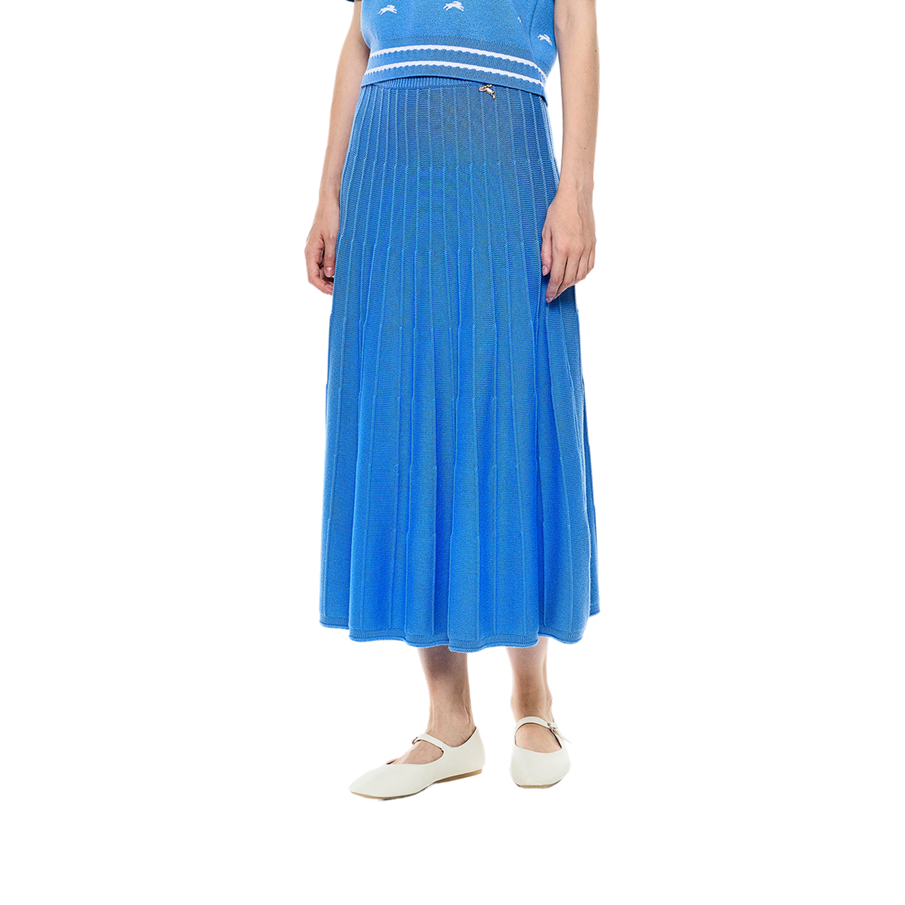 Модель насыщенного ярко-голубого цвета с выразительными вертикальными складками выполнена из мягкого синтетического трикотажа с высоким содержанием тенселя и добавлением кашемира. Ткань эластичная и износостойкая, гладкая и легкая, поэтому в юбке будет комфортно почти в любую погоду