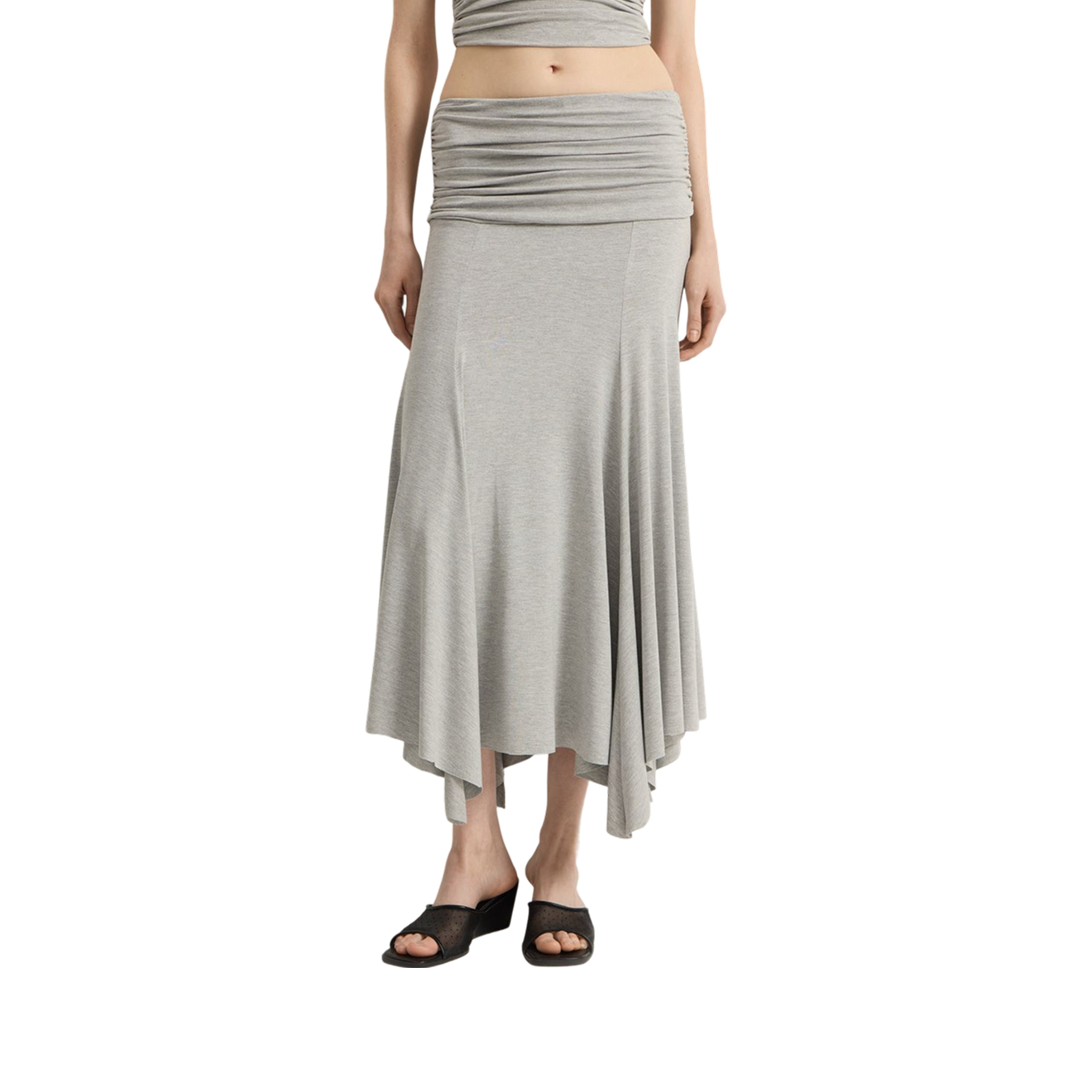 Главные преимущества этой юбки — универсальный серо-бежевый цвет и лаконичный асимметричный крой, которой выглядит интересно, но не слишком экстравагантно. Модель легко впишется в самые разные образы, будь то коктейльный аутфит с бельевым топом и босоножками на каблуке или расслабленный ансамбль на каждый день со свитшотом и кроссовками
