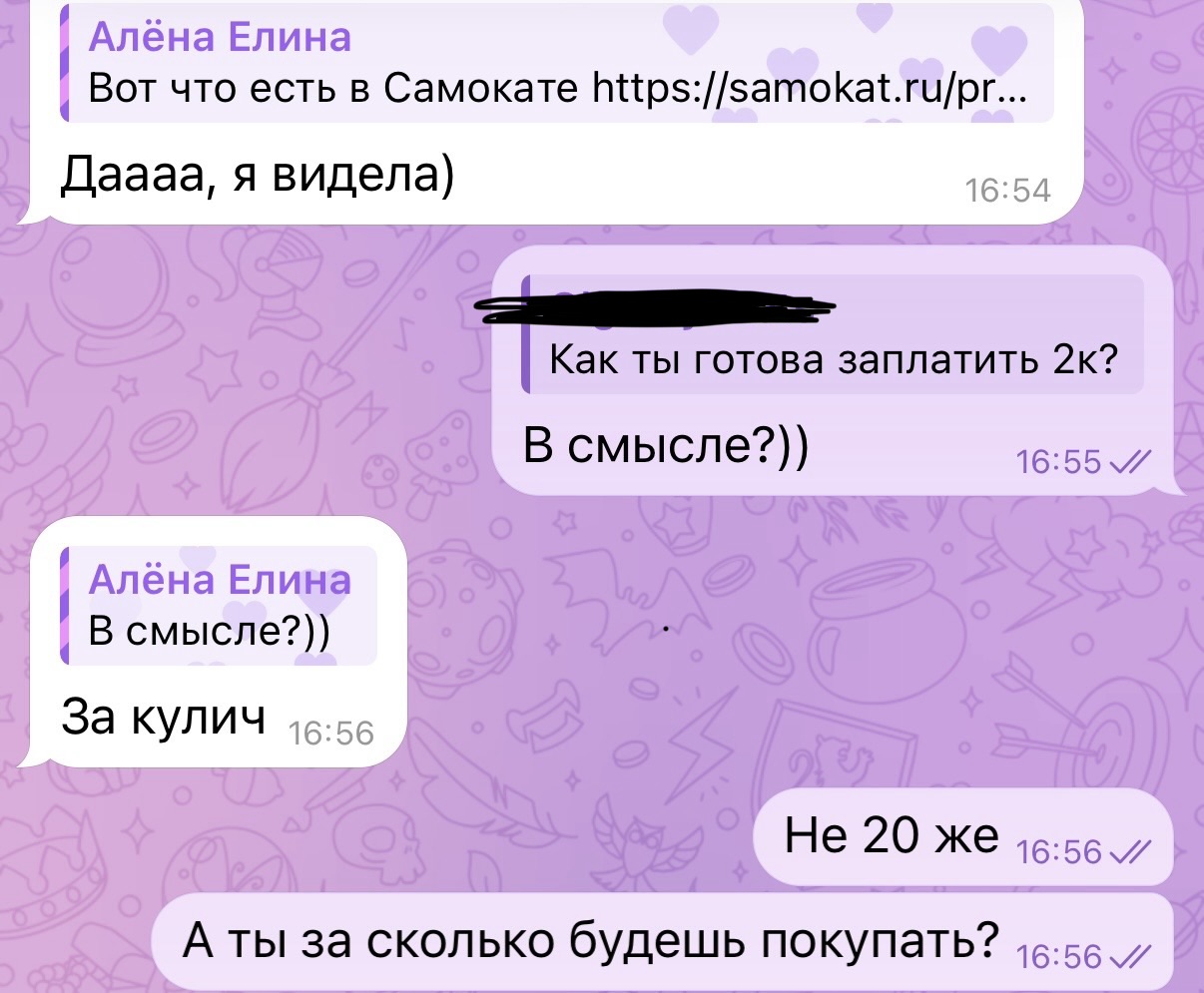 Красивый, отправила ссылку подруге в ответ на то, что она мне тоже фиолетовой прислала (я просто люблю фиолетовые цвет во всем). В итоге у нас состоялась полемика на тему, сколько кто готов заплатить за кулич (скрин прилагаю). В прошлом году она заплатила 7,5 тысяч за три кулича и все невкусные оказались. Поэтому она негодует.