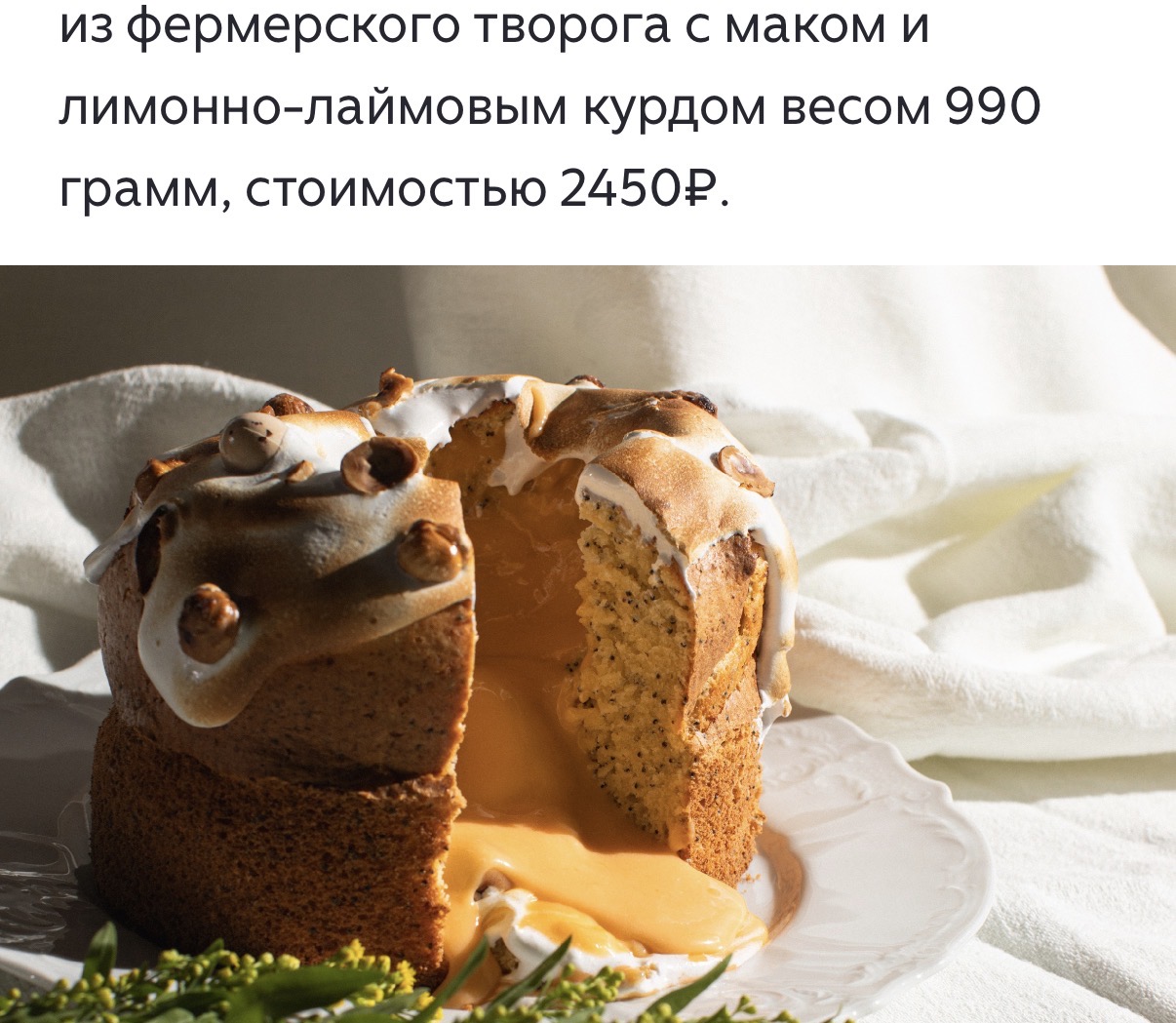 Ставки растут, только что позвонила в ресторан Peach и узнала, что стоимость их куличей составляет 7500 рублей. Вы только посмотрите — это не кулич, а гастрономическая провокация. Вероятно, если человек постился, то такой кулич может довести до головокружения от радости и вкуса. Про вес тоже уточнила: 1,5 килограмм. Прямо как огромный торт.