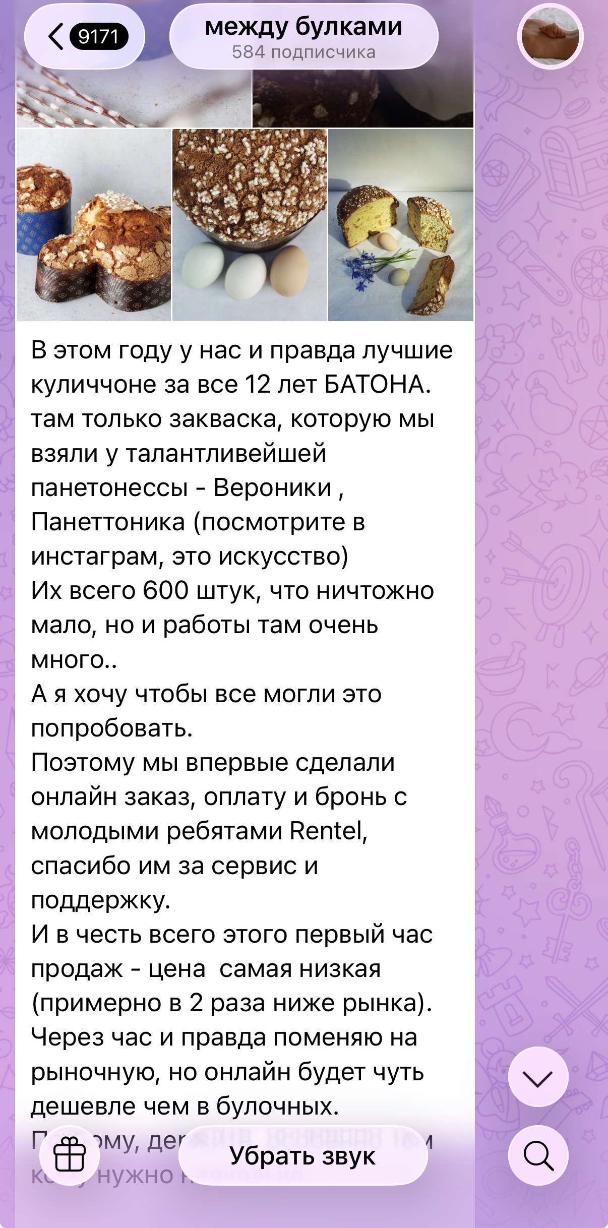 Еще я подписана на канал хлебного сомелье, которая рассказала на днях про ценообразование куличей, вернее куличитонне в их пекарне «Батон», я честно, прямо очень захотела попробовать их куличеттоне. Внешне он похож на итальянскую выпечку, которую привозили из Италии лет 13 назад. Это было бесподобно. Его стоимость 3200 рублей, вот правда нужно ехать на Дорогомиловский рынок, а это далековато. Курьером будет не целесообразно. Скрин прилагаю.
