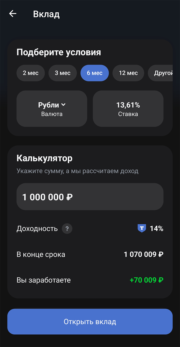 Например, самый выгодный вклад в Т-Банке — сроком на полгода со ставкой 13,61% годовых. У вкладов на меньший срок ставка чуть ниже — 13,5%. Вклады на 6—9 месяцев дадут 11% годовых. Годовой и двухлетний — 10 и 8% соответственно. Это без учета капитализации процентов — с ней доходность выше, особенно у длинных вкладов. Но все равно самым выгодным за счет лучшей ставки остается вклад на 6 месяцев: с учетом капитализации процентов он принесет 14%.