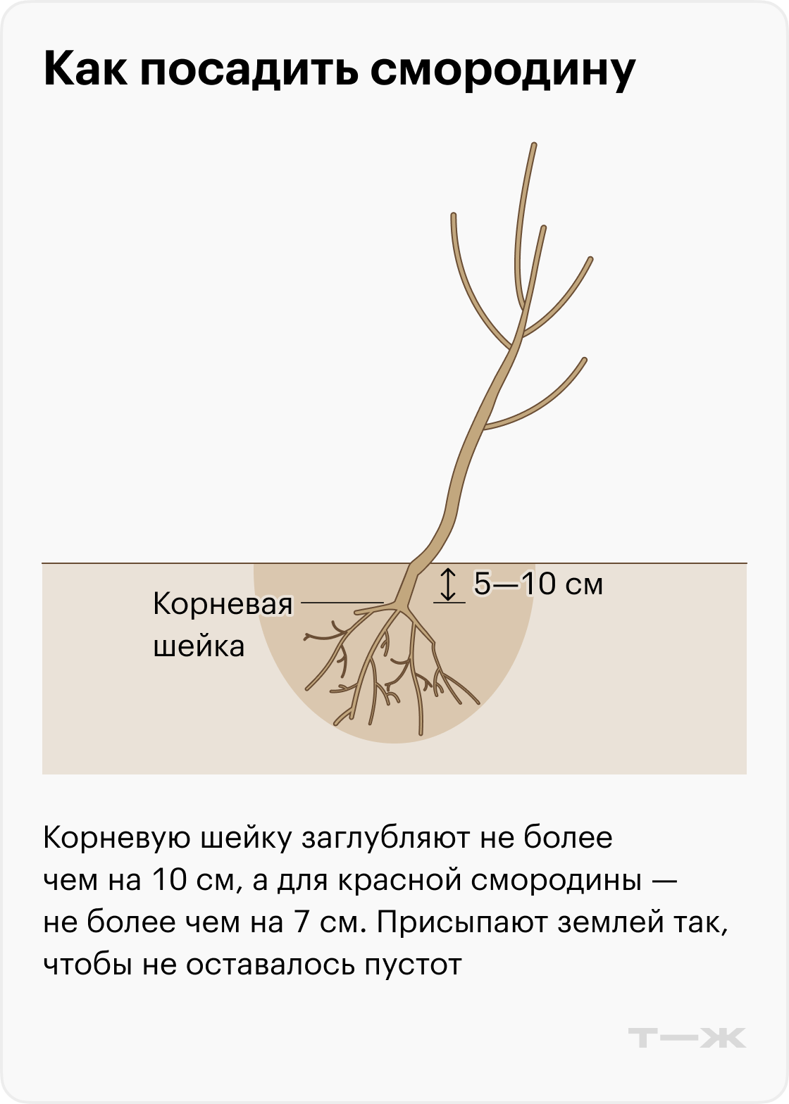 Саженец черной смородины размещают с заглублением корневой шейки до 10 см, красной — не более 5—7 см.