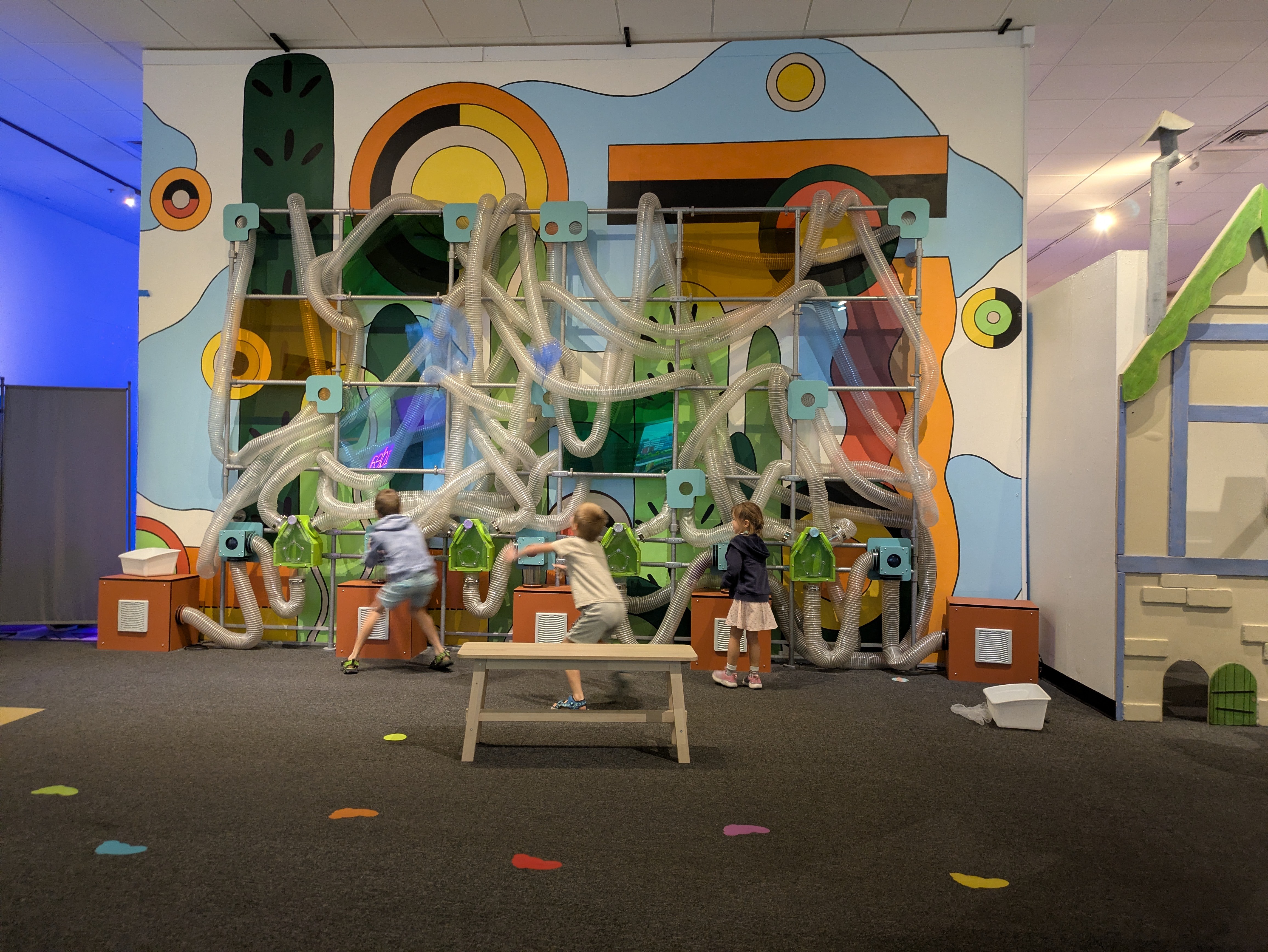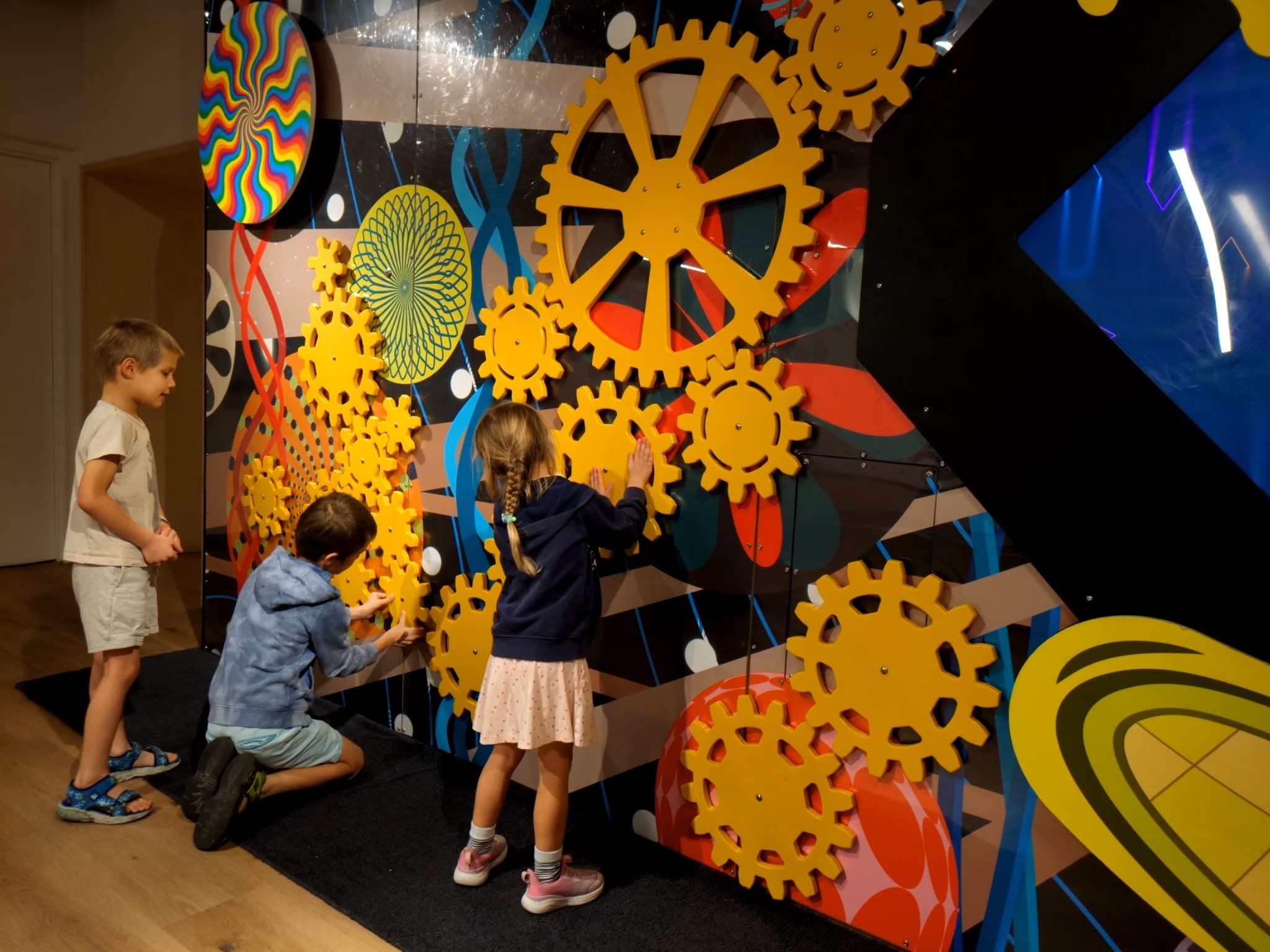 Любимая точка притяжения детей в таких музеях — воздушный лабиринт, где внутри прозрачных труб создан ветряной поток, который несет легкие цветные платочки и выплевывает их через разные выходы.