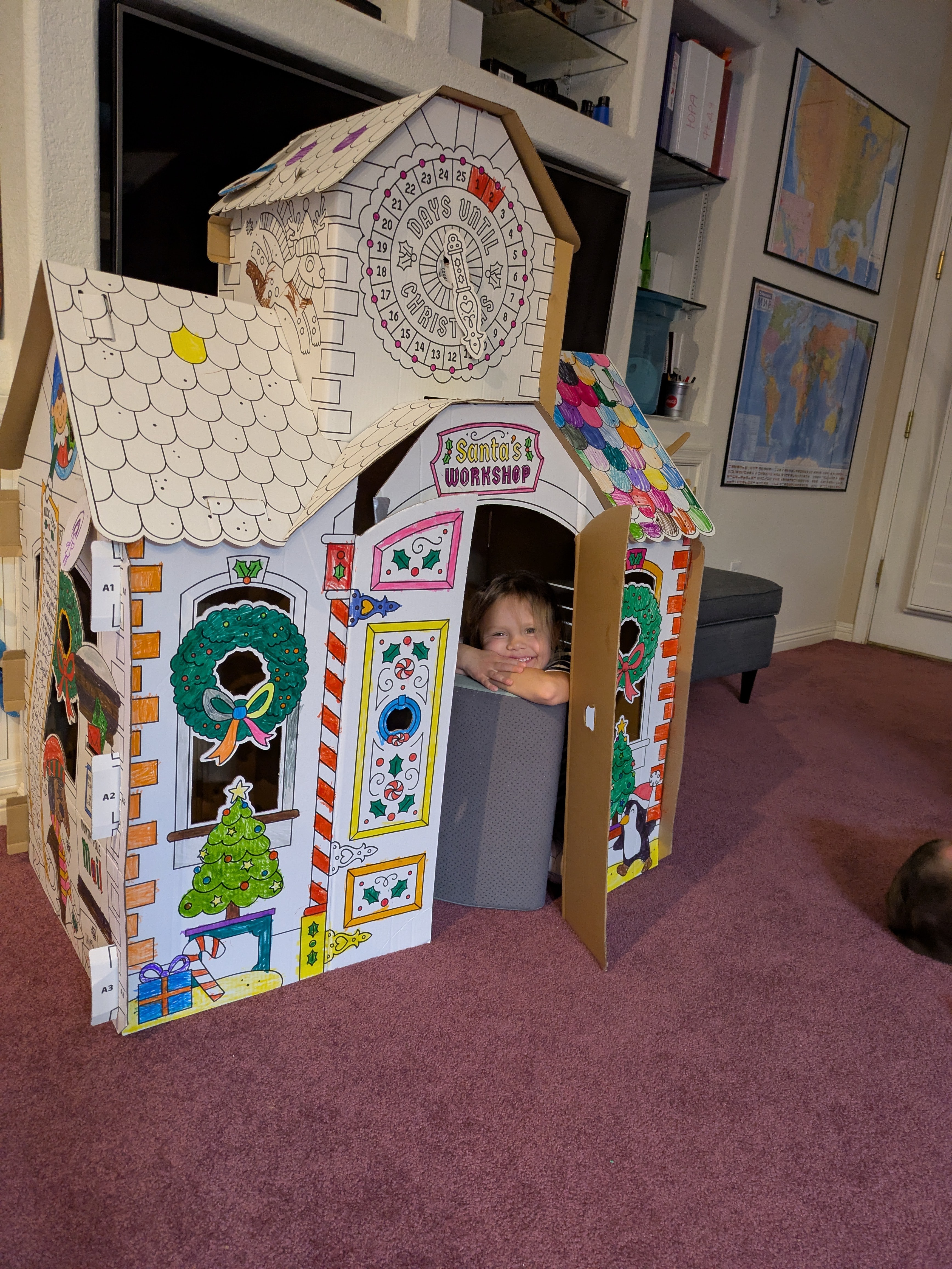 Еще одна небольшая инвестиция, которая окупилась. После местного Рождества мы с мужем ездим по магазинам в поисках подарков и новогодних развлечений, потому что все продается с хорошими скидками. Особенно быстро улетают вещи типа наборов Лего и детских трендов. Мы обычно покупаем фейерверк и бенгальские огни, докупаем какие-то подарки от Деда Мороза и печенье, чтобы дети его украшали — все к Новому году. Еще в этот раз взяли картонный дом-раскраску за $15 вместо $30. Оказалась отличная покупка: дети долго и с удовольствием раскрашивали, забирались внутрь и бросали картонные кольца на картонные же рога оленя.