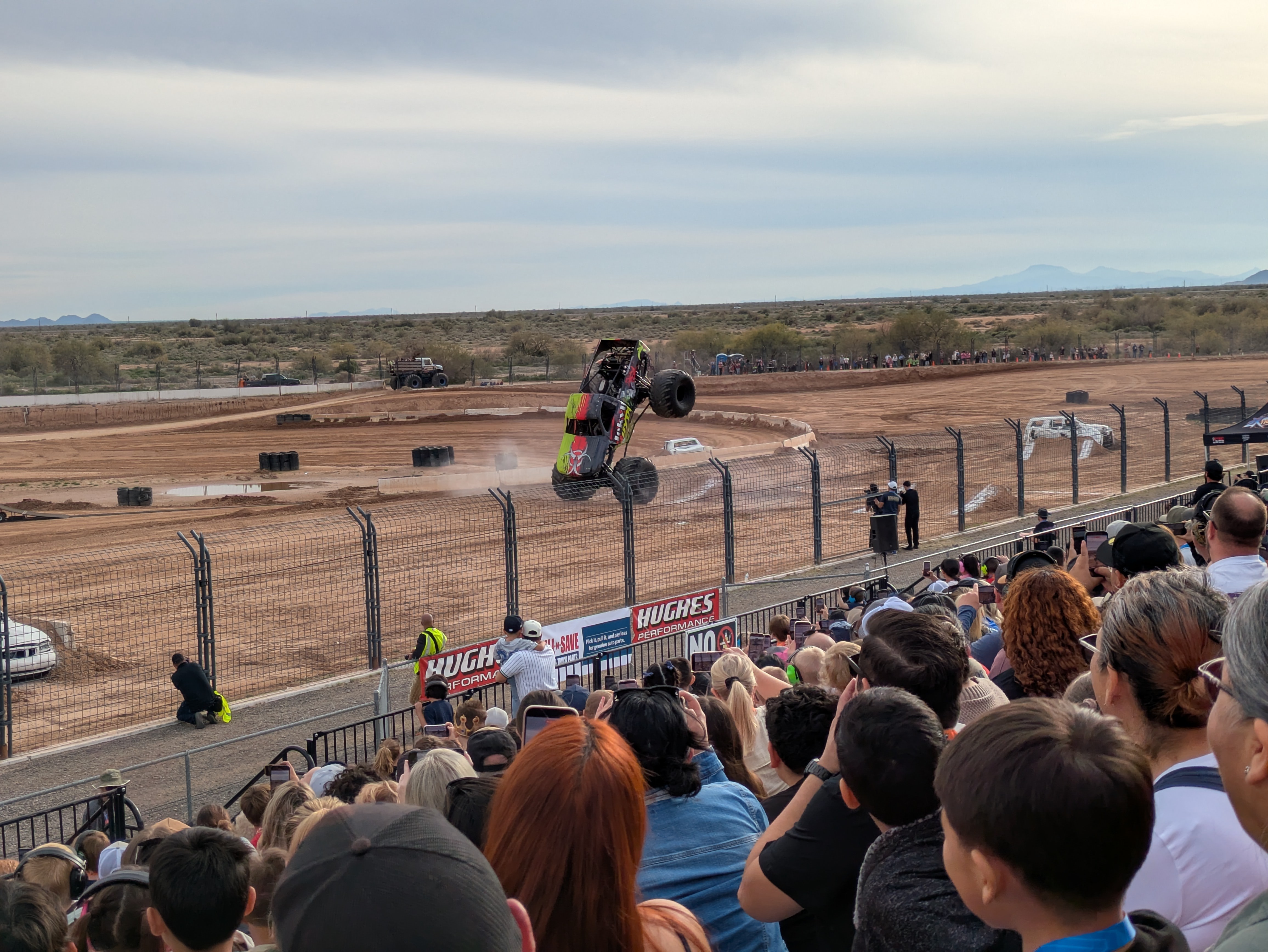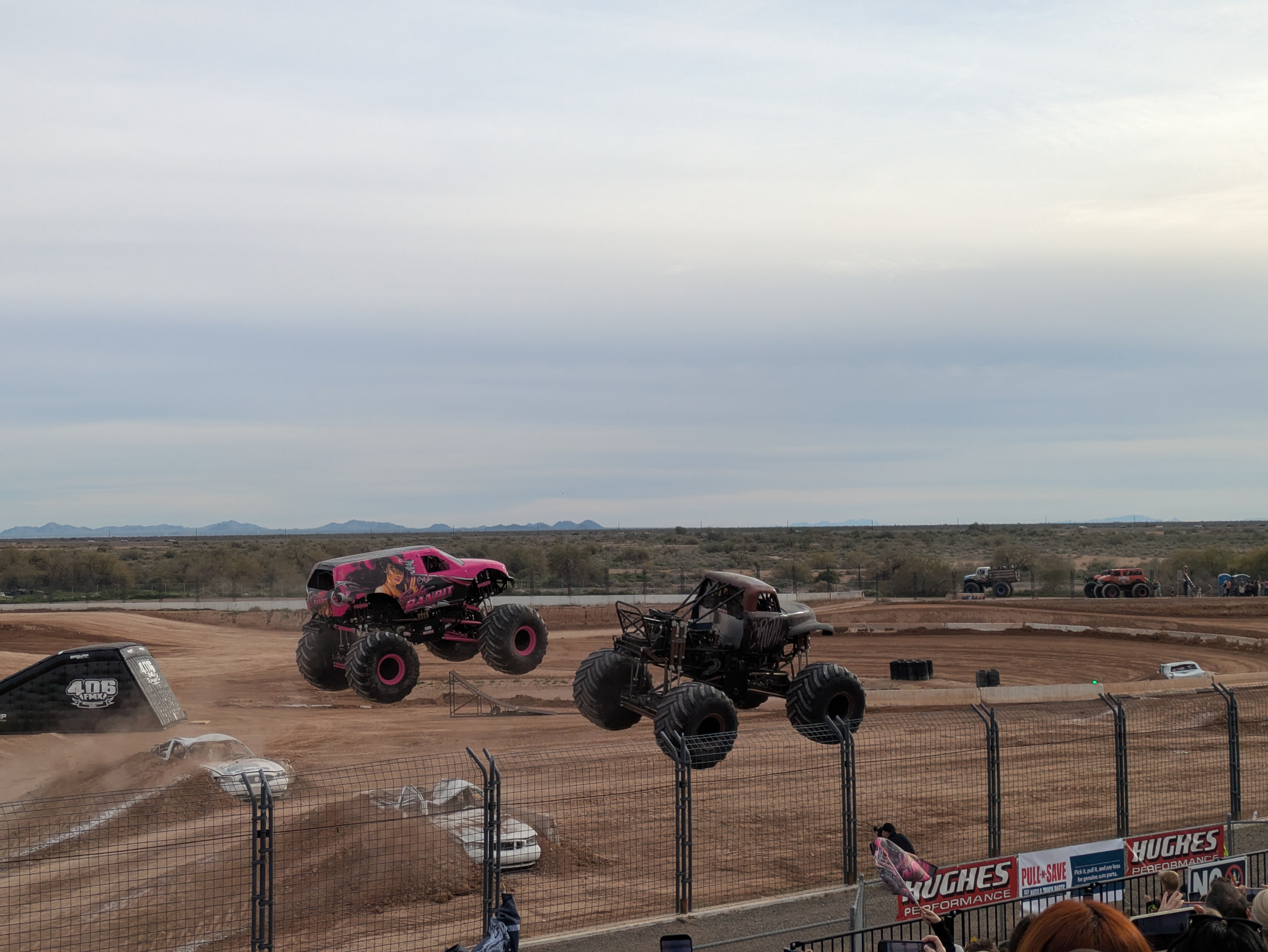 В январе мы традиционно посещаем шоу монстр-траков. Это своеобразные гастроли: отдельные компании монстр-траков постоянно устраивают туры по разным штатам, разъезжая в течение нескольких месяцев. Пока в Аризоне зима и относительная прохлада, проходят несколько различных шоу — мы выбираем то, что проводится ближе всего к дому. Билеты на пятерых стоили $100 и парковка $10.