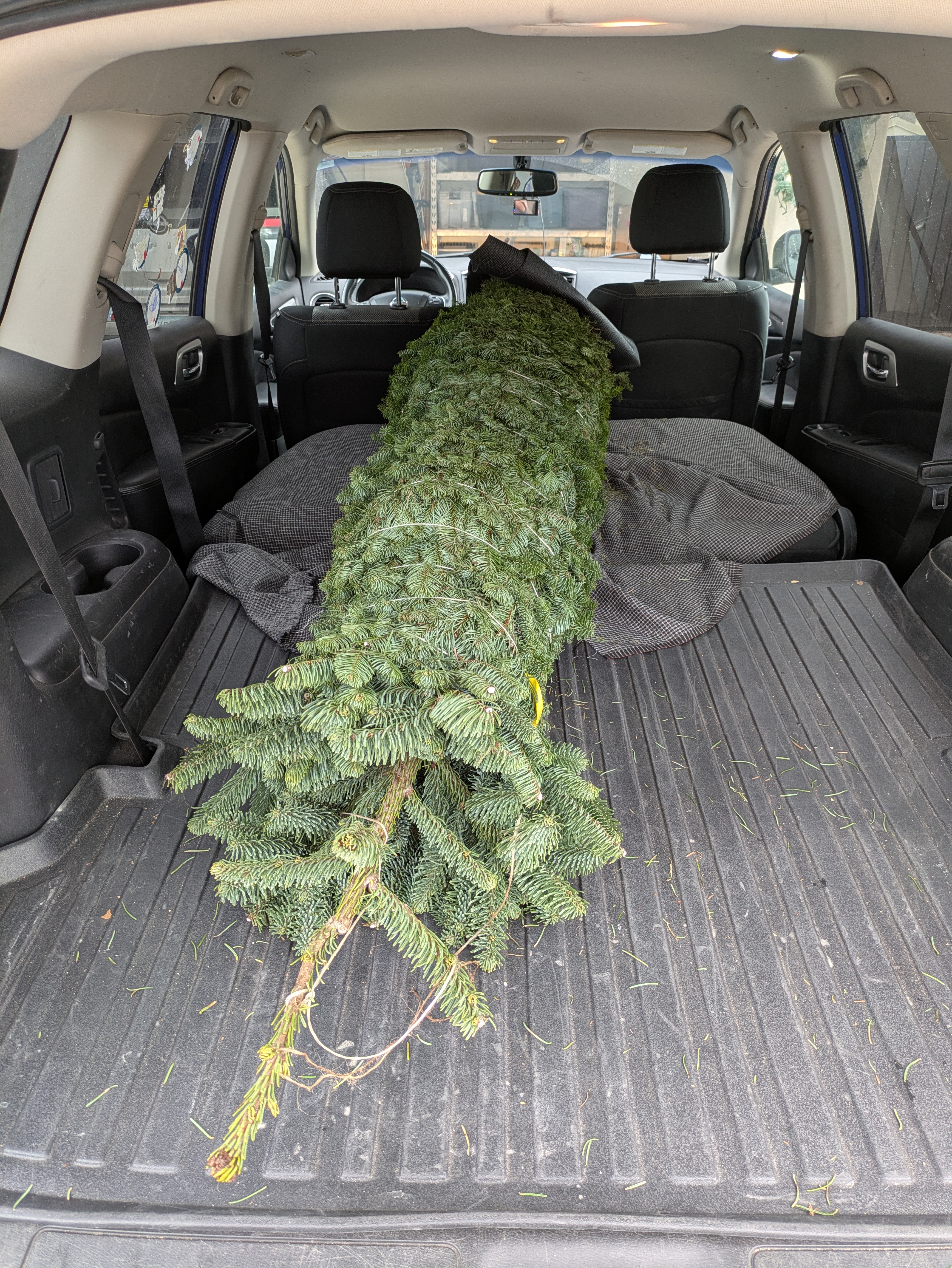 Параллельно с поездками на природу, удалось провернуть аферу с приобретением бесплатной живой ели. 24 декабря все продавцы уже избавляются от елочек и закрывают рождественские базары. Не все готовы отдавать ненужные деревья просто так, но если поискать, то можно найти питомник, где разрешают забрать ель в обвязке. Обычно сначала я провожу разведку, а потом приезжает муж на машине со сложенными задними рядами, и забирает деревце к нам во двор.