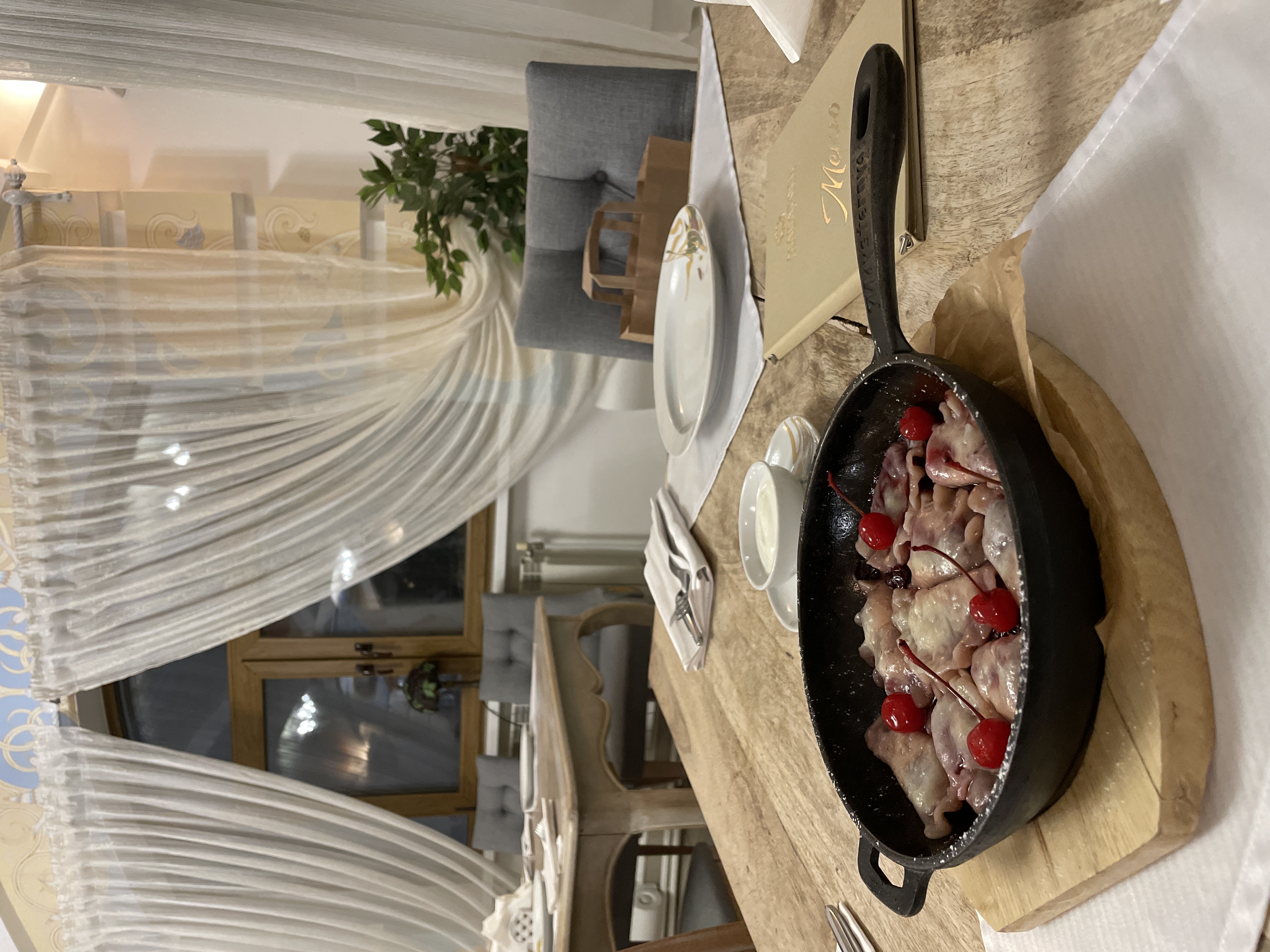 Вареники красивые. Принесли на горячей сковородке в вишневом соусе, отдельно тоже сметана подавалась. Вкусно невероятно, правда сладко-сладко.