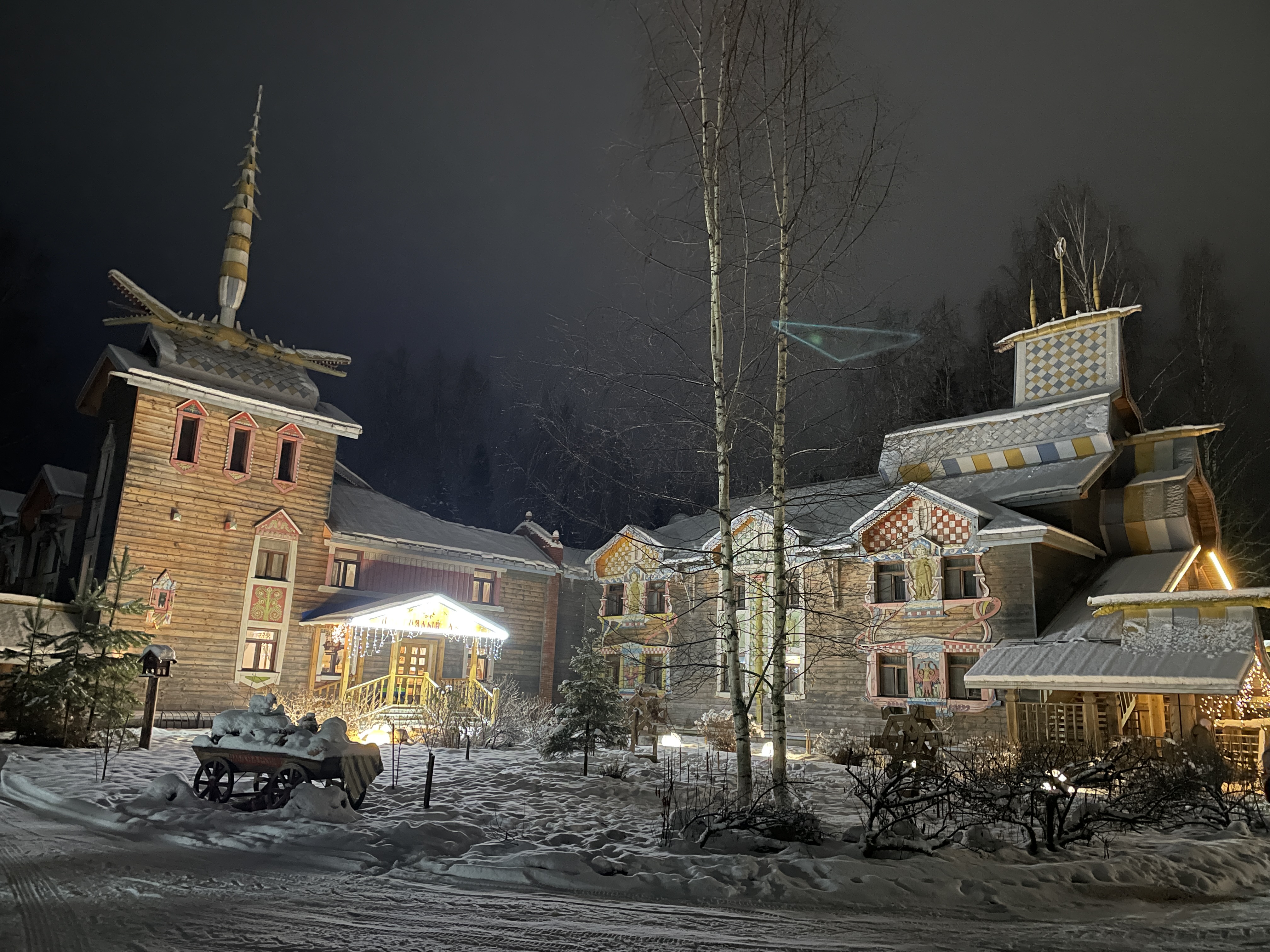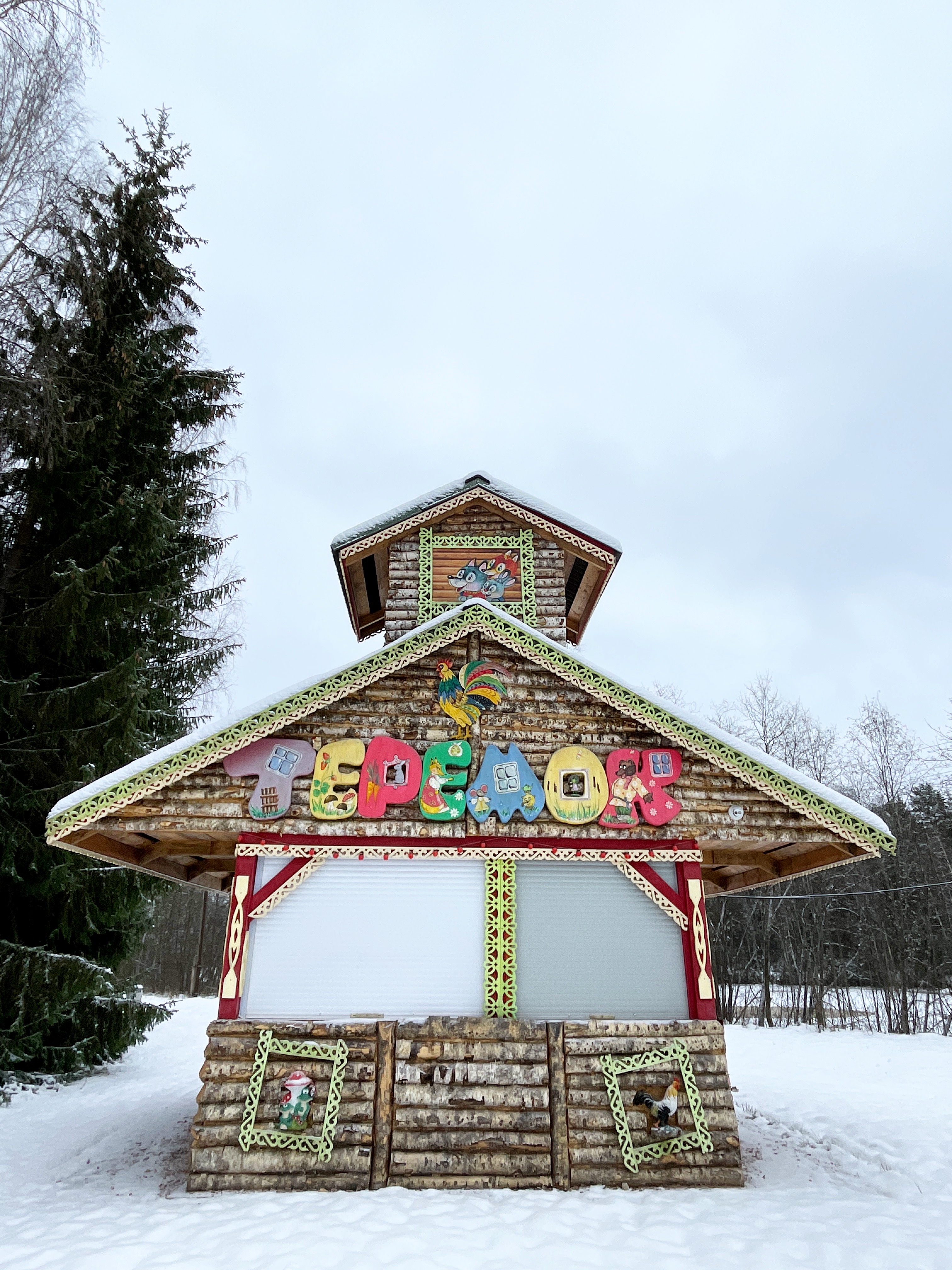 Забавно конечно, но когда мы проезжали пост охраны, въезд на территорию деревни, заиграла сказочная музыка, когда ворота открывались. Это так мило. Сразу же стояли фигурки бабы яги и других героев.