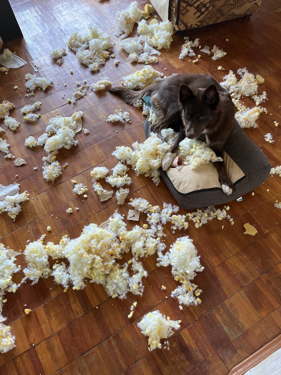 Уничтожались игрушки, двери, подушки от диванов, переворачивались мусорные ведра, кралась еда, она скулила, драла входную дверь изнутри, давала всем вокруг узнать, что она дома одна. В первом случае всё разрешил процесс дрессировки и физические нагрузки — как только я начала грузить ее мыслительными процессами и совместными пробежками или долгими играми с другими собаками, она уставала и мирно спала дома, но грустно смотрела, когда я уходила.