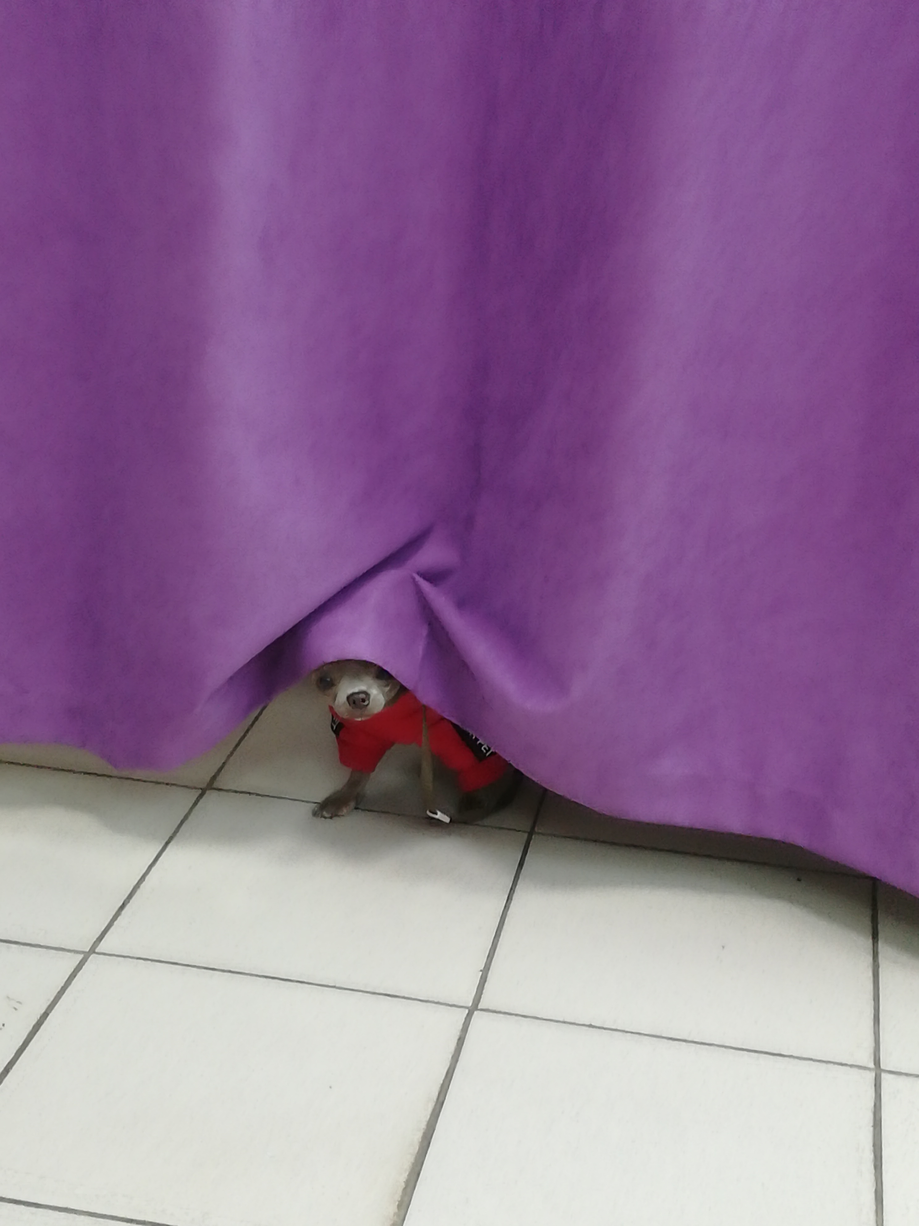 Фото питомца: собака Феофаня примеряет свитерок в примерочной Wildberries