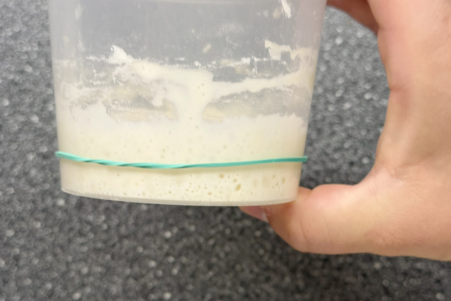 Шаг 2. Через 1—2 суток закваска начнет подниматься — вы заметите это по стенкам баночки. Еще на поверхности смеси появятся пузырьки. На этом этапе закваска может неприятно пахнуть уксусом или ацетоном — это нормально.