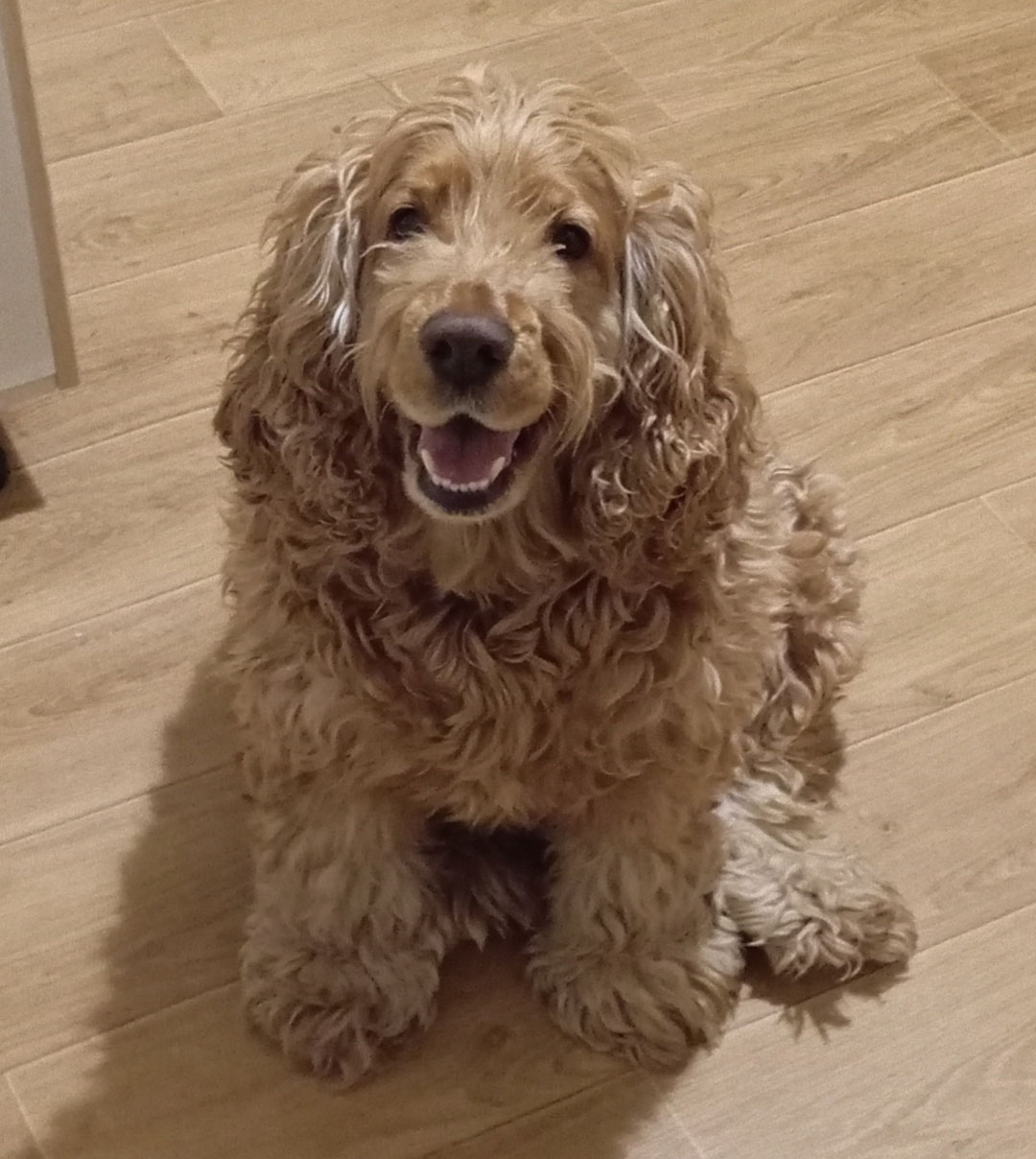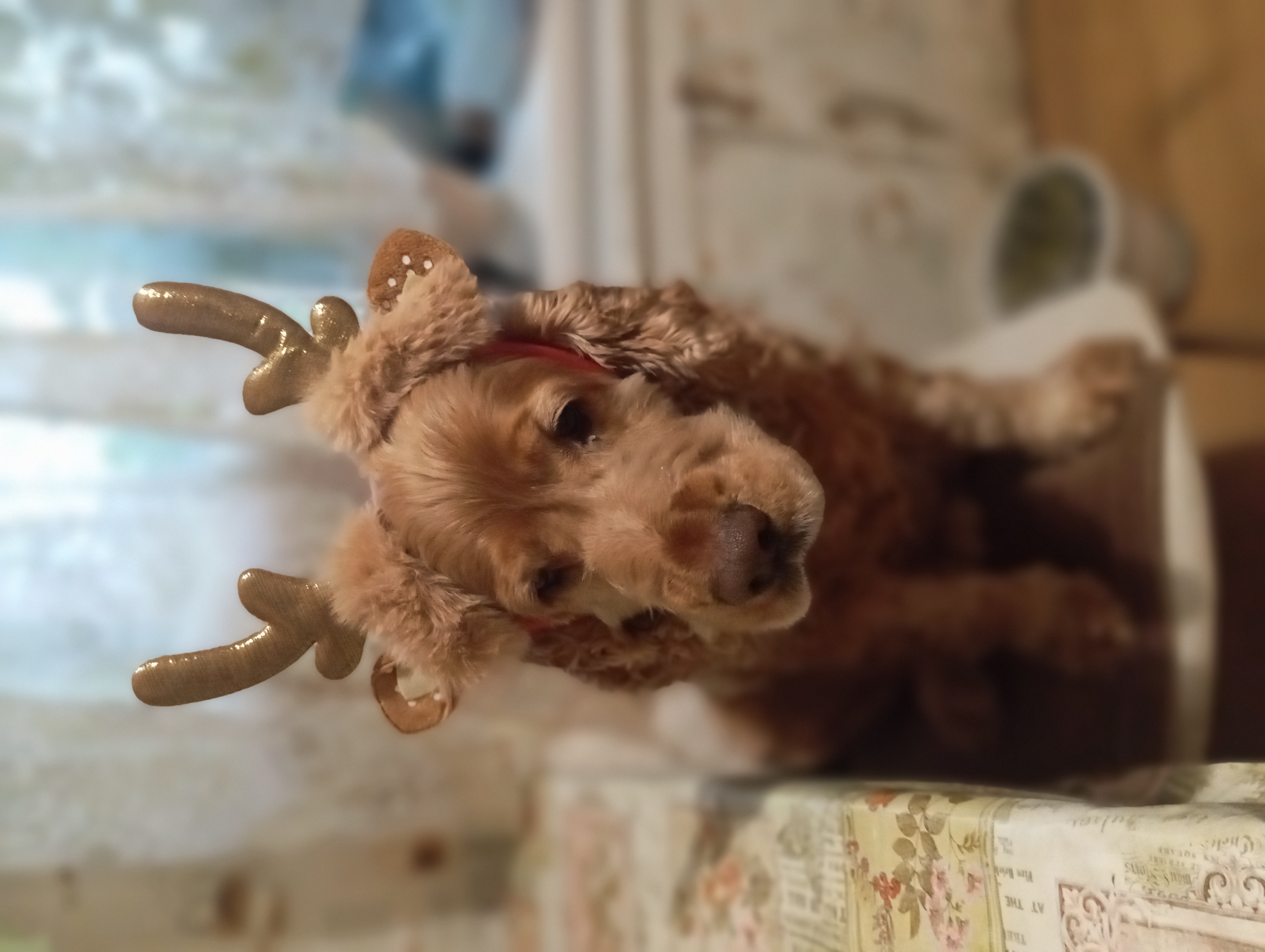 Фото питомца: спаниель Мартюша примеряет рога оленя
