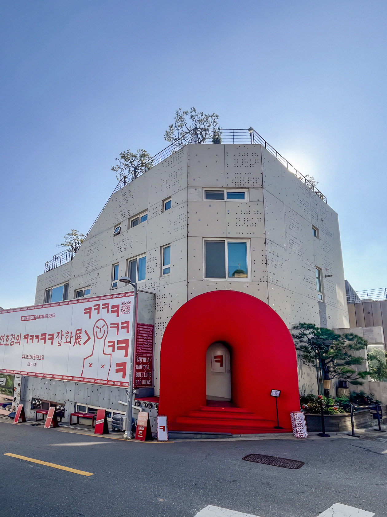 В Сеуле я ходила в музей искусства Leeum компании Samsung. Рядом с ним увидела очень необычное серое бетонное здание с ярко-красной аркой. Мне показалось, что оно похоже на игрушечное существо с большими алыми губами, как из «Улицы Сезам». Внутри меня встретил длинный красный коридор с приглушенным светом. Я прошла внутрь и оказалась в фирменном магазине корейской парфюмерной марки Borntostandout.