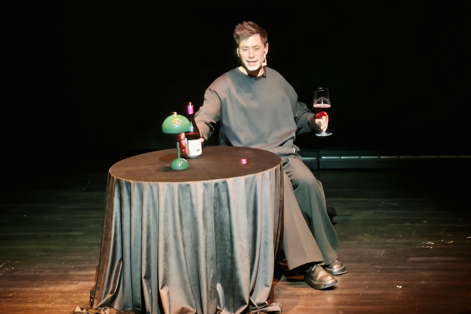 Зал уютный и просторный, расстояние между креслами приличное, мы и вовсе сидели на балконе на комфортных диванчиках — все было видно отлично. С декорациями авторы особо не заморачивались — стол, стул, бокал вина и большой экран, где демонстрировали картины, о которых в данный момент шла речь.