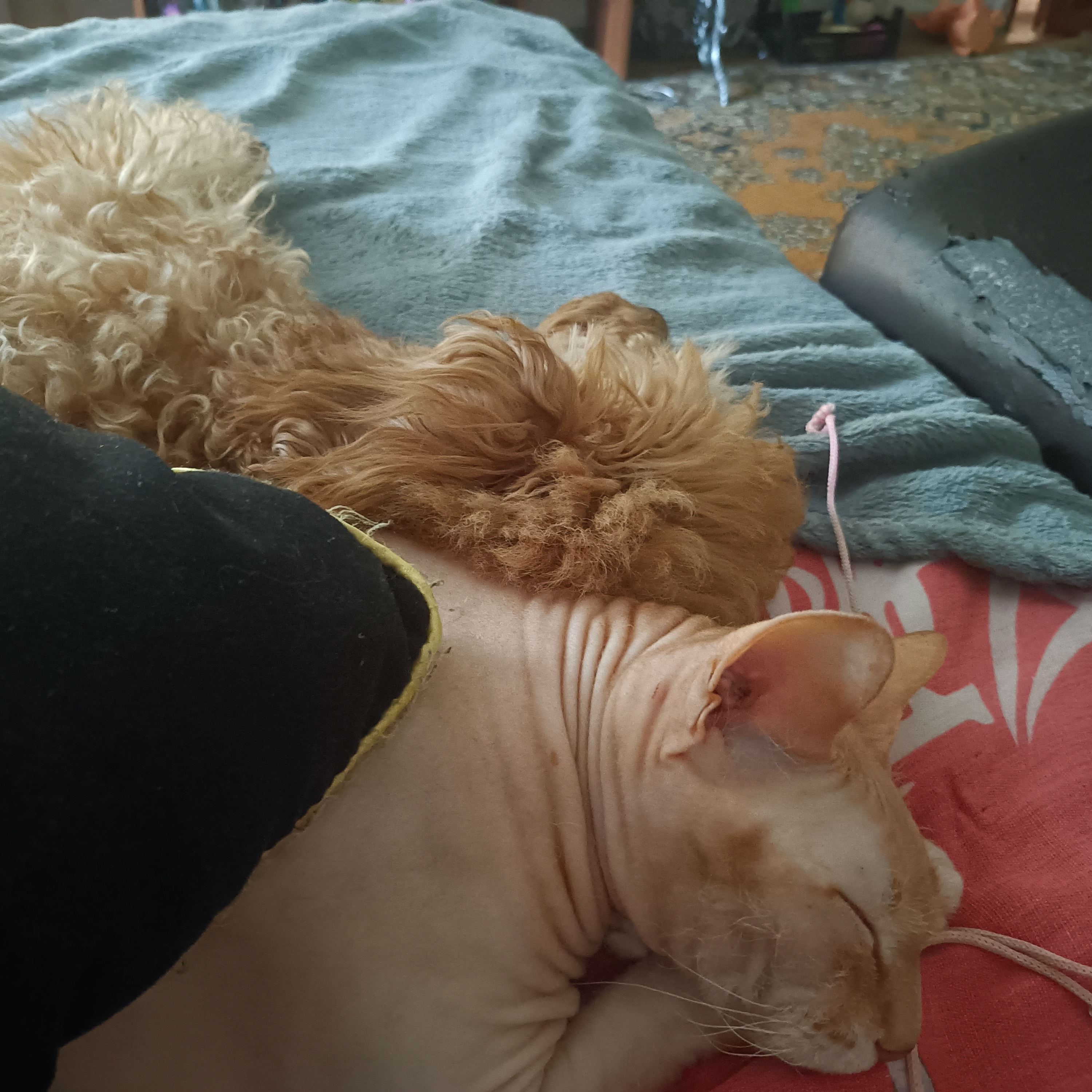 Фото питомцев: сфинкс браш Моисей и карликовый пудель Фиджик спят