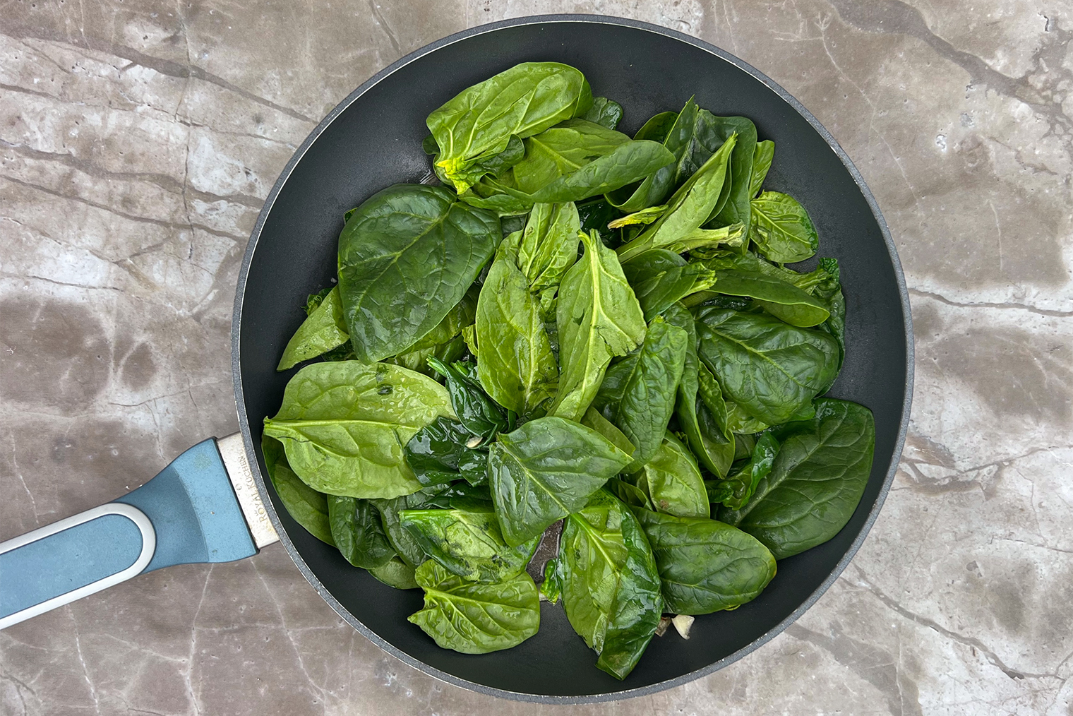 Шаг 6. Шпинат выложите в сковороду к чесноку, посолите и поперчите. Обжаривайте еще 1—2 минуты. Зелень должна уменьшиться в несколько раз.