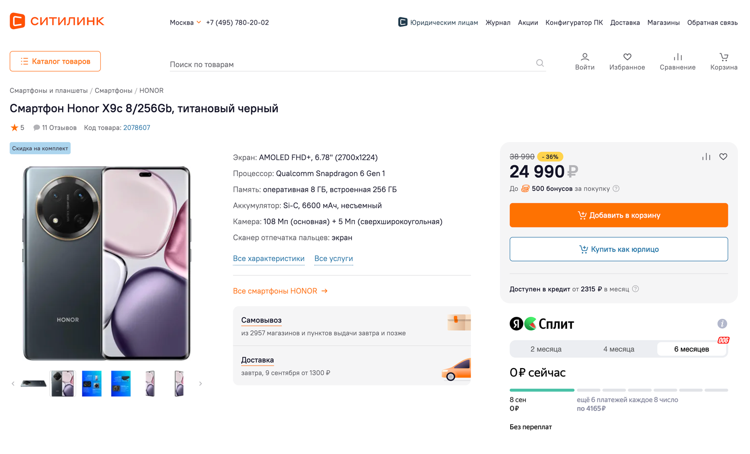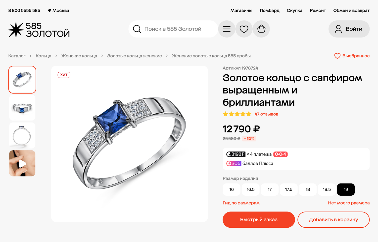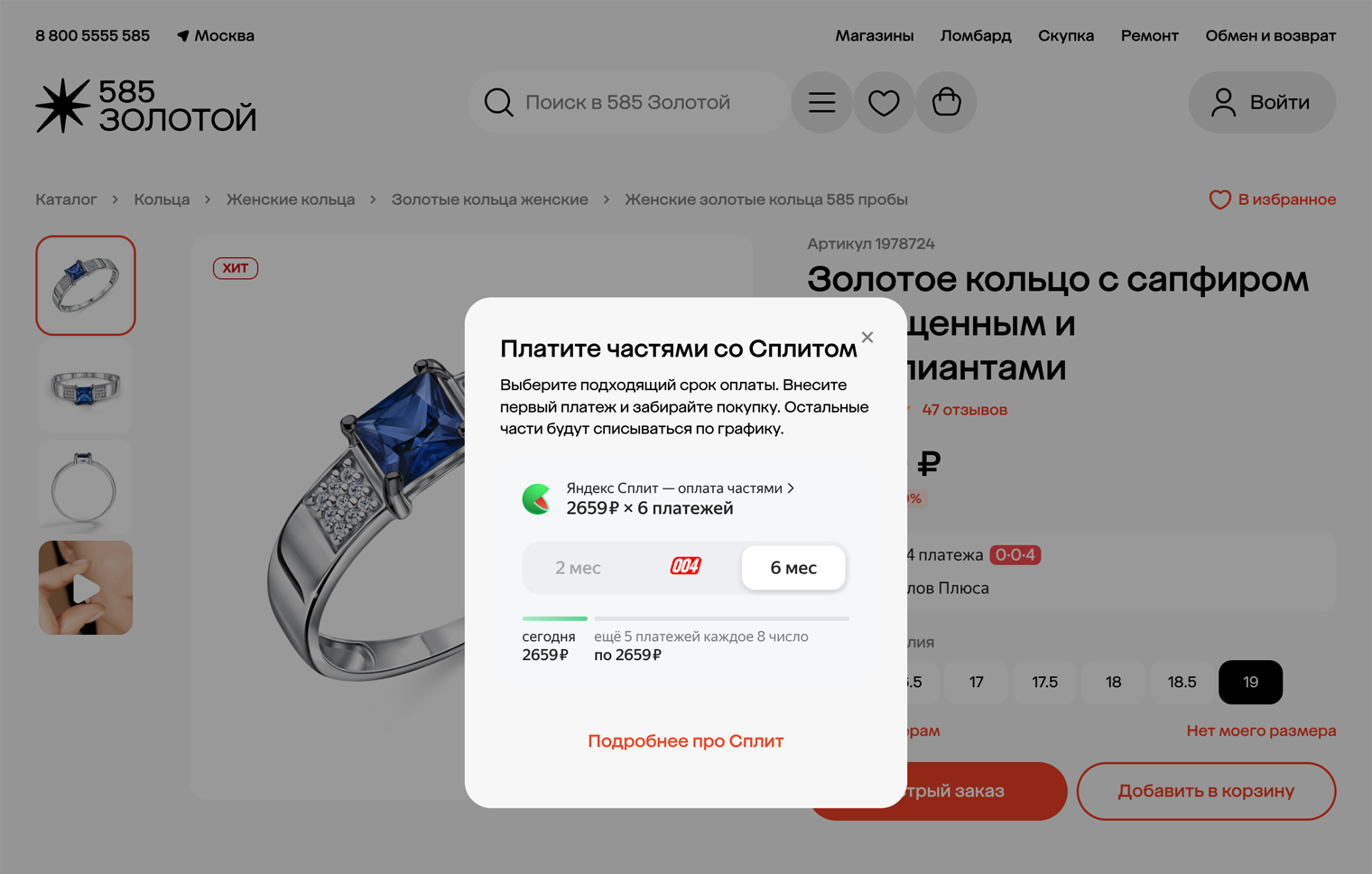 Пример 2: первый платеж — сразу. В магазине «585 Золотой» мне понравилось кольцо за 12 790 ₽. Его можно оплатить частями с помощью «Яндекс Сплита»: вносить шесть платежей по 2 659 ₽ с интервалом в месяц, но первый платеж — сразу.