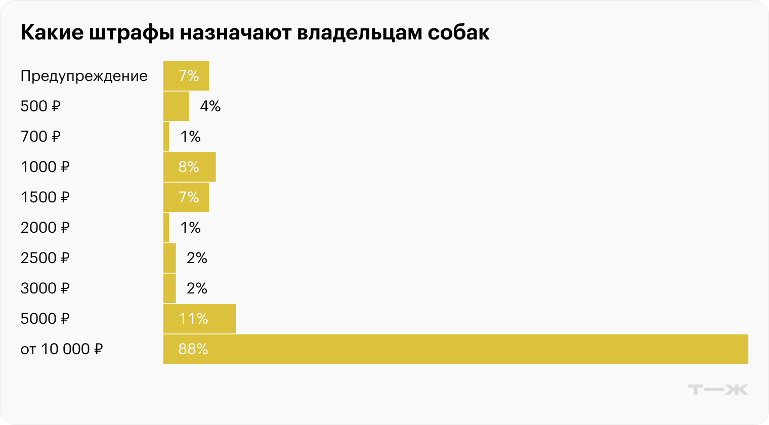 Штрафы чаще всего назначали за вред здоровью или имуществу — по части 3 статьи 8.52 КоАП РФ. Поэтому самой распространенной мерой наказания стала сумма 10 000 ₽ — минимально возможный штраф по этой статье: его получили владельцы животных в 84 из 132 рассмотренных дел . Тем не менее в некоторых случаях суды шли на снижение штрафа до 5 000 ₽. Например, в Иволгинском районном суде Бурятии наказание смягчили для женщины, находящейся в декретном отпуске с детьми.