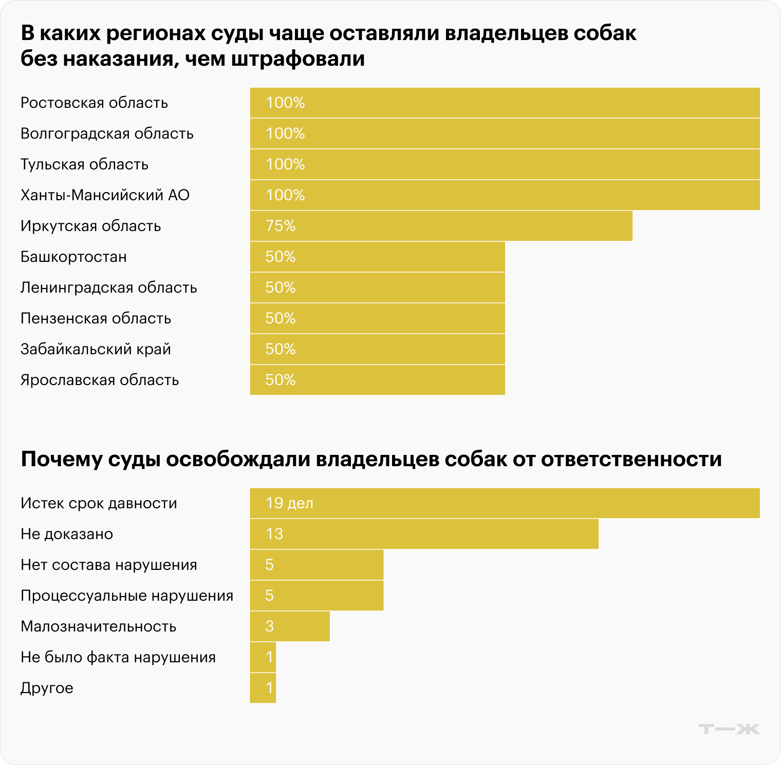 Чаще всего владельцы собак избегали штрафа в Иркутской области — шесть оправдательных дел из восьми. В Ростовской, Волгоградской и Тульской областях, а также в Ханты-Мансийском автономном округе штраф отменили для всех нарушителей, но дел было мало: всего по одному-два в каждом.