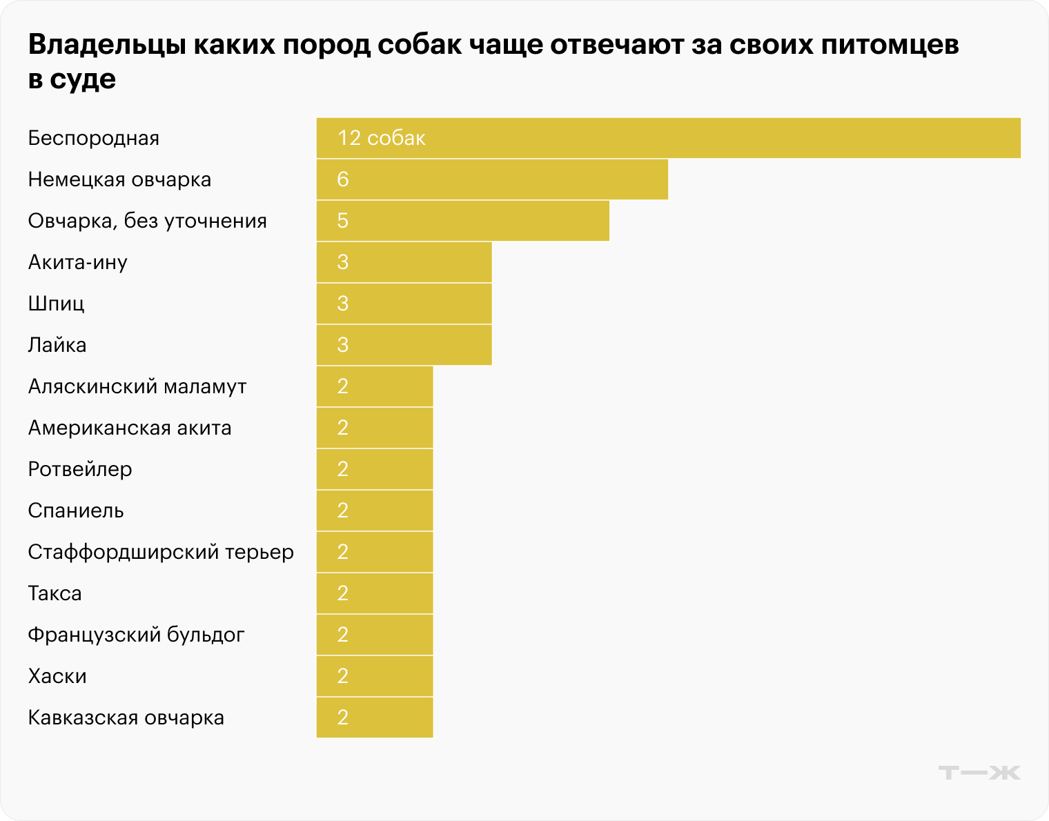 Самое частое правонарушение, которое рассматривают в судах, связано с нападением собаки на человека или другое животное — примерно две трети от общего количества дел. При этом случаев атаки на человека больше, чем на животное: 72 против 39 разбирательств .