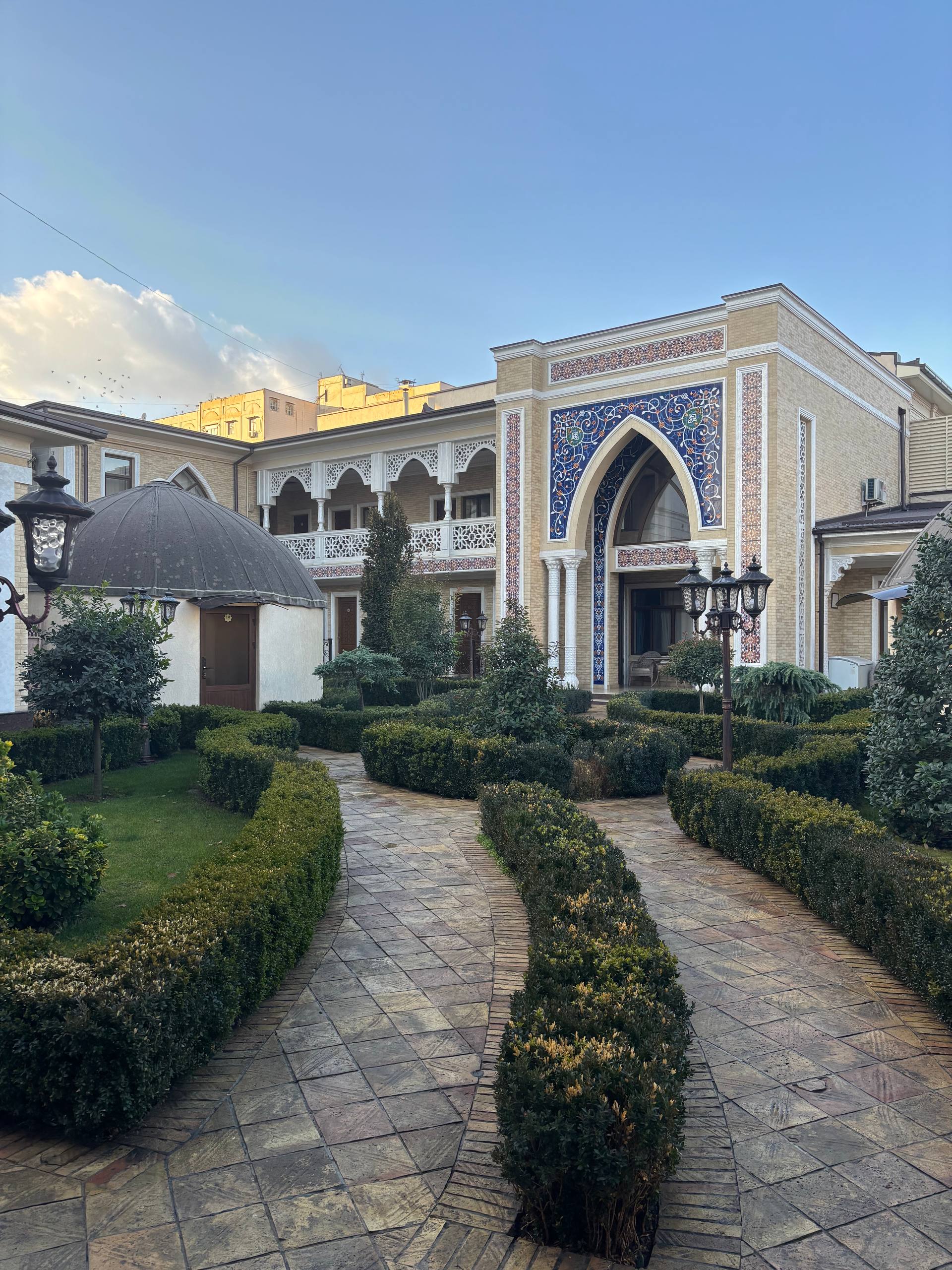 Наверное, больше всего мне понравился двор моего отеля. Утром у меня был совершенно сказочный вид на купол цирка. Концерт тоже был отличный, но он бы мог быть в любом другом городе. Приятно удивили узбекские новостройки, по крайней мере в центре. Я известный хейтер новостроек по многим причинам. Но эти, по крайней мере, хорошо выглядят, они в классическом стиле, создают уют. Не знаю, из чего и по каким технологиям они сделаны, но город они не уродуют. Кстати, в Душанбе новостройки тоже симпатичные.