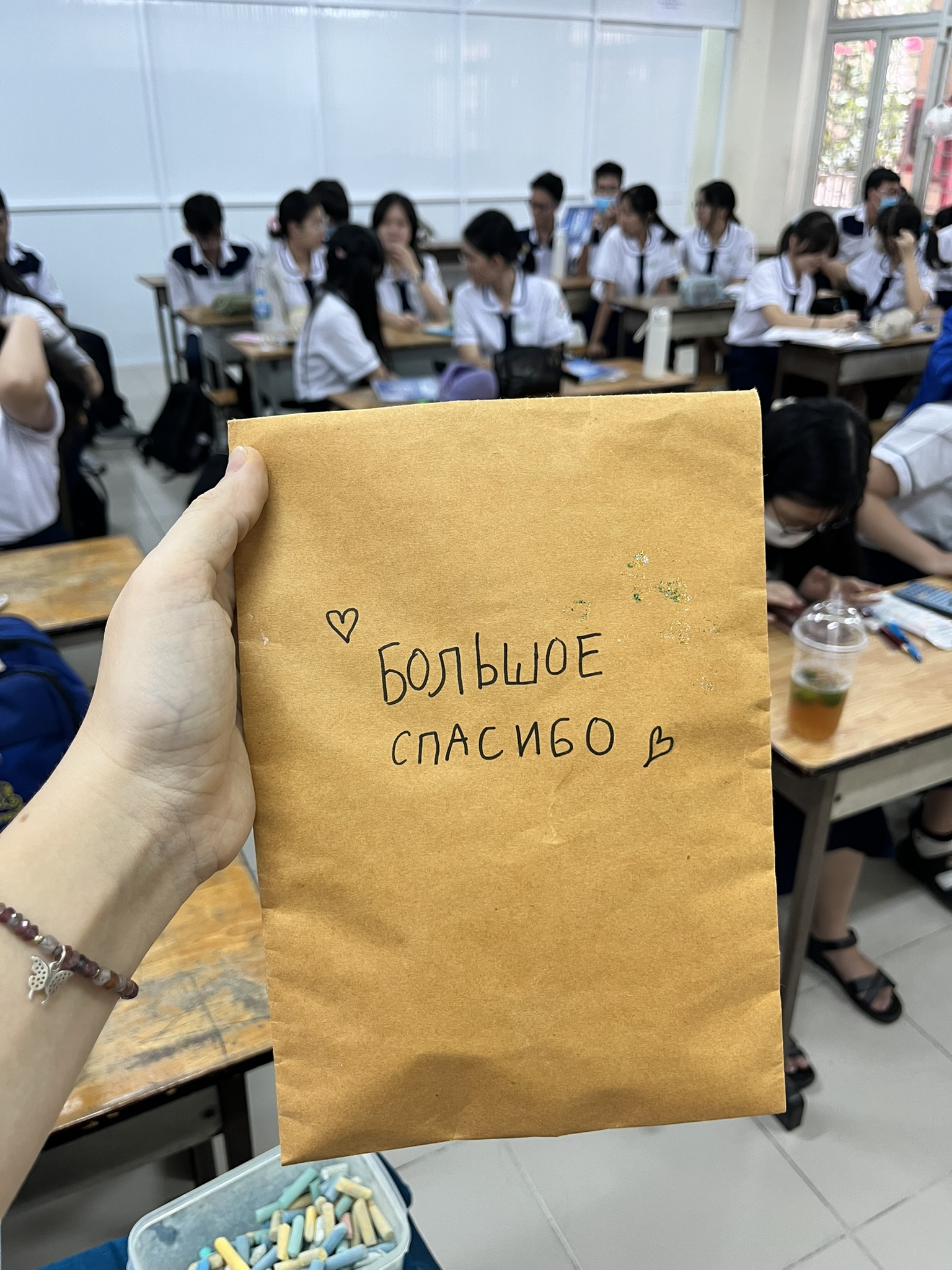 Топ самых необычных подарков, которые я получала во Вьетнаме, точно займёт отдельное место в моей памяти. Один класс попросил меня закрыть глаза и вытянуть из огромной коробки две вещи — мне попались соль и острая паста с креветкой. Потом были термосы, кружки с гравировкой и сумочка для бутылочки с водой. Это чисто азиатская тема: без воды на улицы Азии лучше просто не выходить, поэтому бутылки есть у всех. А чтобы не таскать их в руках, а тем более это неудобно на байке, сумочка для бутылки — отличный выход. Мои ученики сделали её сами, и я до сих пор пользуюсь ею дома, в России.