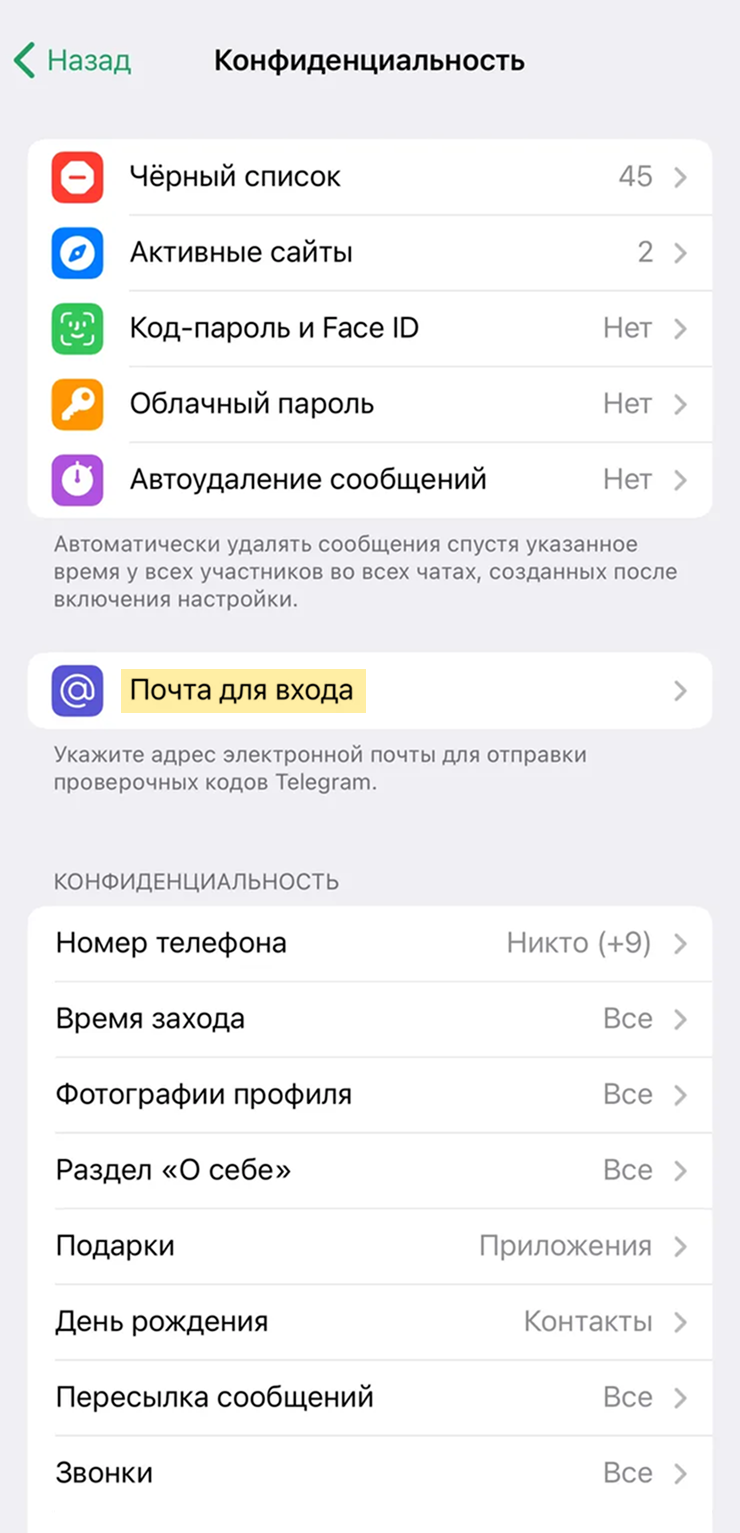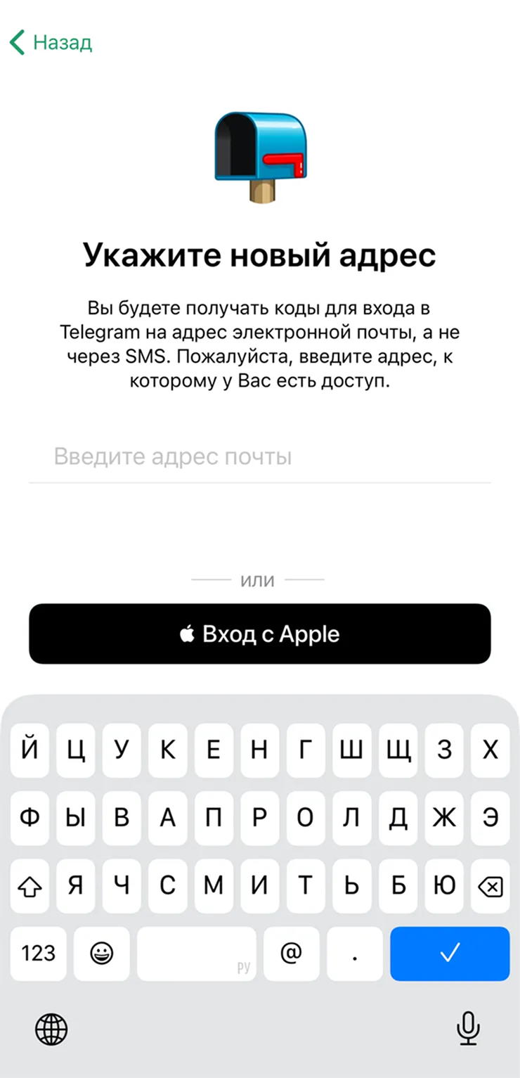 - Во вкладке «Почта для входа» укажите свою почту, на которую хотите получать коды. Если пользуетесь мессенджером на iOS, то вместо почты можно привязать Apple ID, а на Android — аккаунт Google.