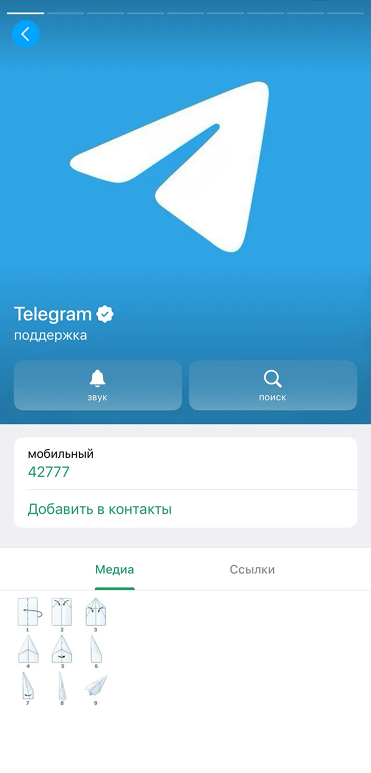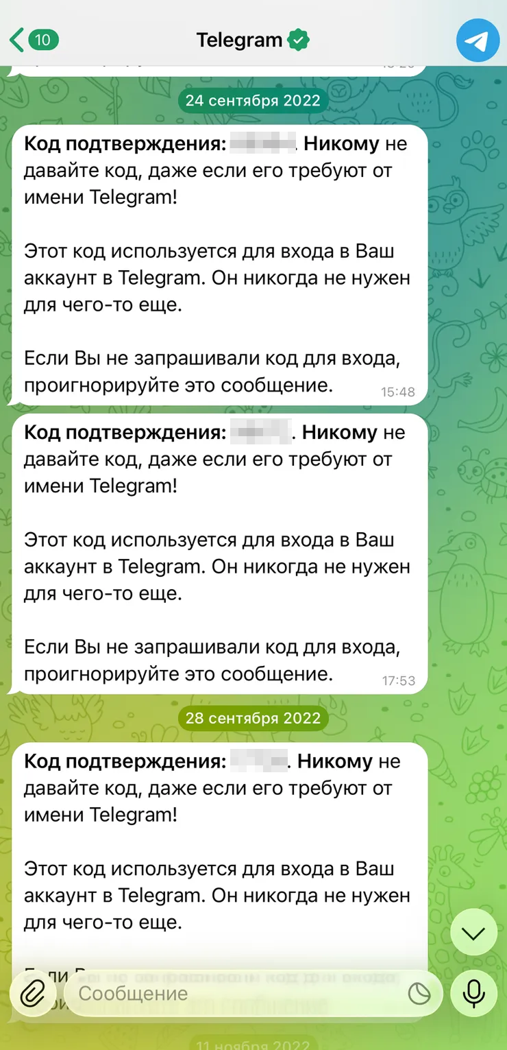 В таком случае одноразовый код для авторизации придет в чате с аккаунтом Telegram — это канал служебных уведомлений, который привязан к номеру +42777.