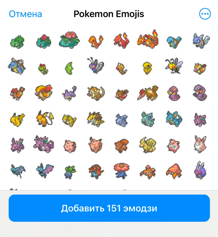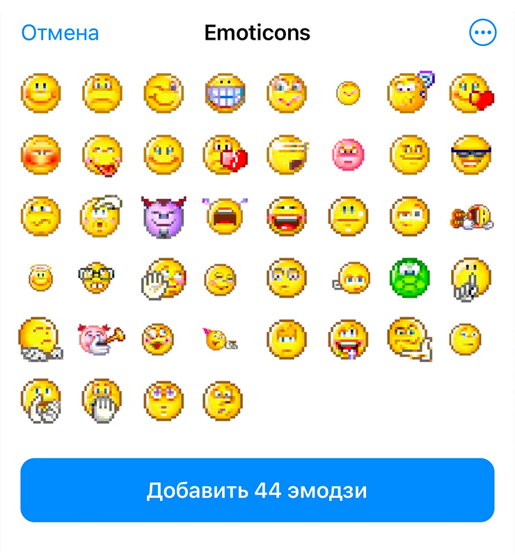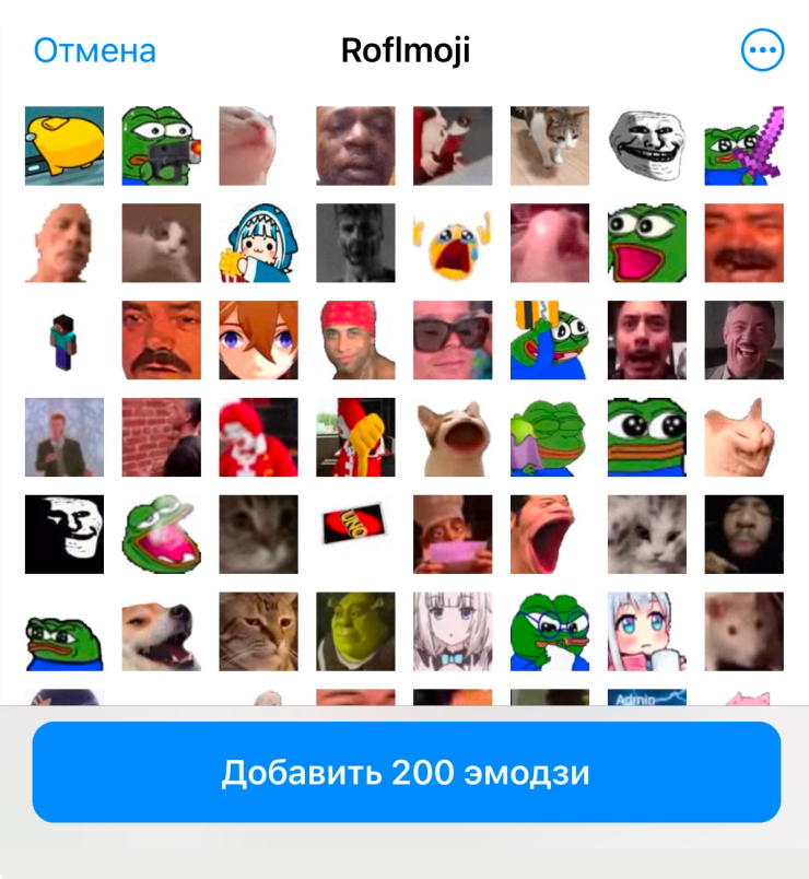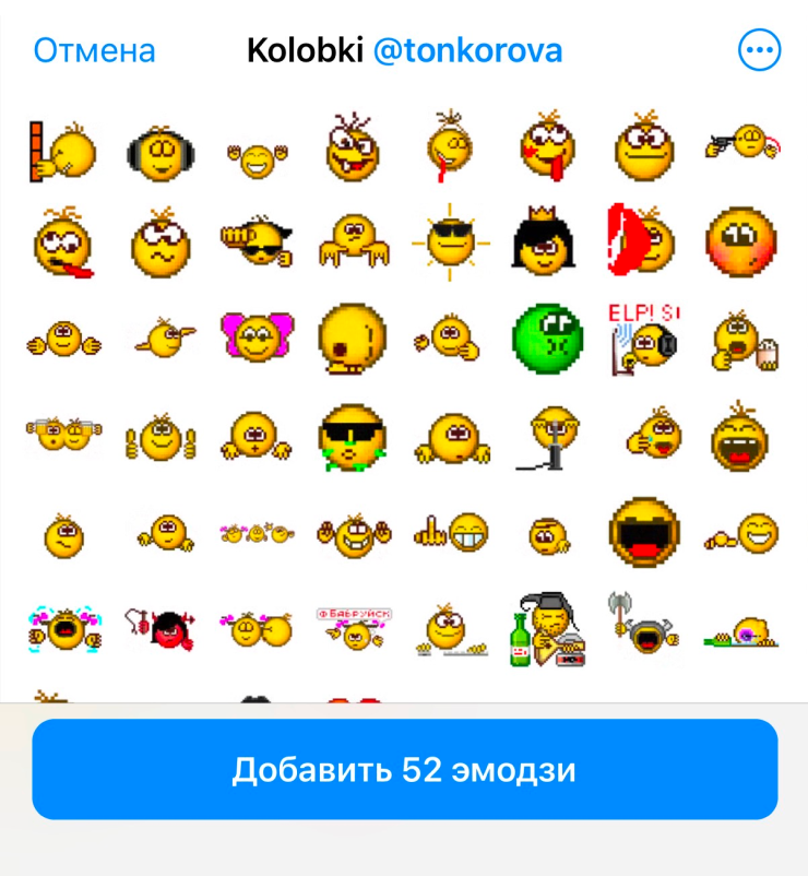 «Достать» из сообщения. Для ситуаций, когда вы увидели интересный эмодзи в чужом сообщении без ссылки на набор. На телефоне зажмите сообщение, появятся стандартные опции вроде «Скопировать» или «Переслать», а снизу — сообщение «В этом наборе эмодзи из набора x». Нажмите на это уведомление, откроется полный набор с возможностью добавления.
