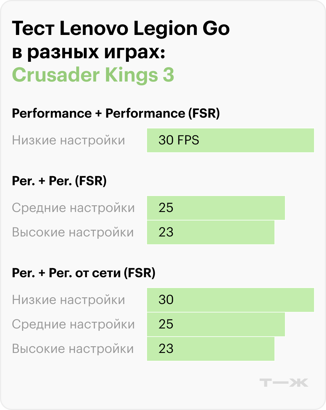 Со стратегиями ситуация сложнее. В Crusader Kings 3 при максимальном разрешении и высоком качестве графики Legion Go выдает лишь 15—20 FPS, чего недостаточно для комфортной игры. На низких и средних настройках показатели увеличиваются до 23—30 FPS. При этом в стратегиях особенно полезен режим вертикальной мыши на съемном контроллере: он заметно упрощает управление интерфейсом.